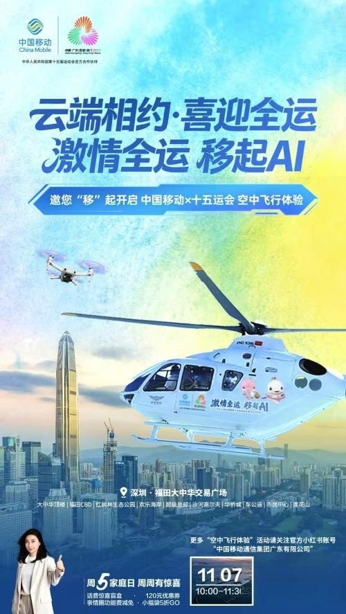 此次活动由中华人民共和国第十五届全国运动会官方合作伙伴的广东移动举办。在全运会开幕前夕,广东移动创新推出“中国移动·激情全运,移起AI空中飞行体验”,以低空飞行震撼视角提升赛事关注度,掀起全民助威热潮,展现“云端助威”与全运盛会的创新融合。