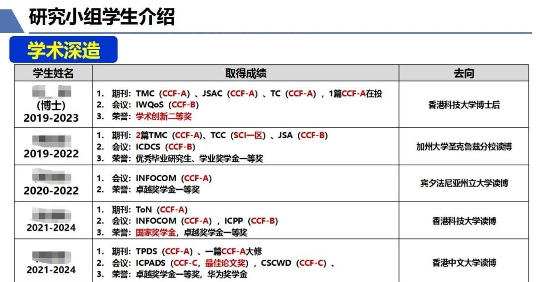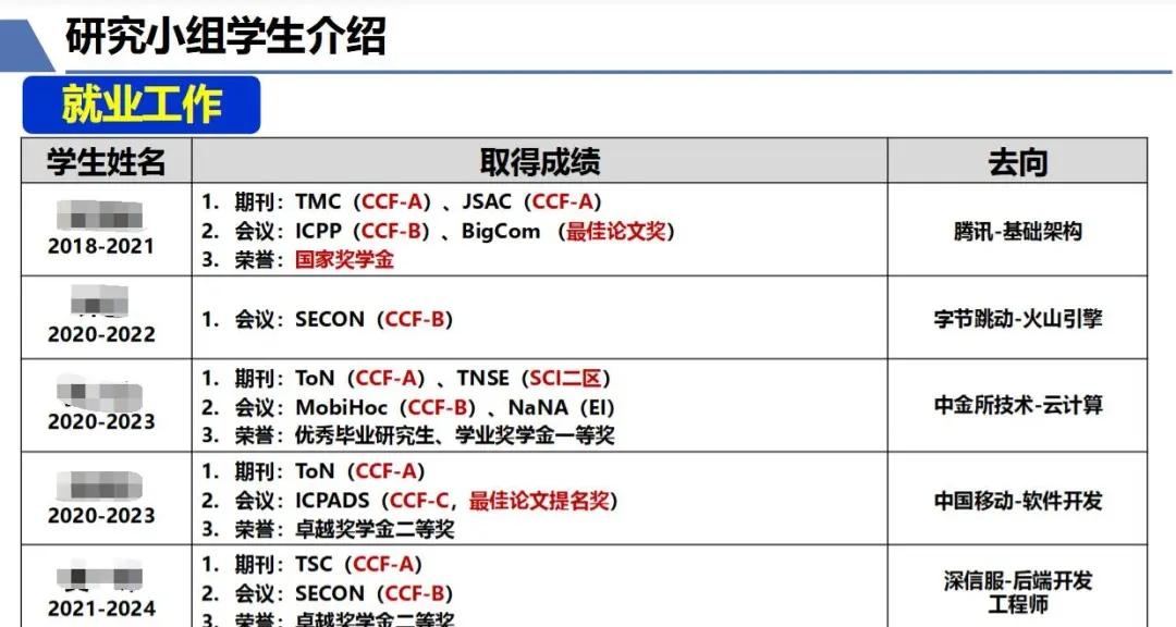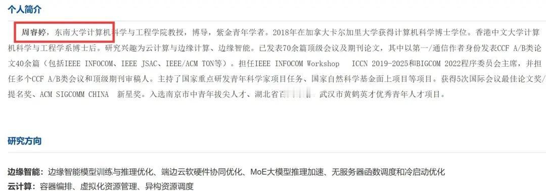 本硕博均可托付!东南zrt教授及其学生去向 Ruiting Zhou,东南大学计算机科学与工程学院教授,博导,紫金青年学者。2018年在加拿大卡尔加里大学获得计算机科学博士学位。香港中文大学计算机科学与工程学系博士后。研究兴趣为云计算与边缘计算、边缘智能。已发表70余篇顶级会议及期刊论文,其中以第一/通信作者身份发表CCF A/B类论文40余篇(包括IEEE INFOCOM、IEEE JSAC、IEEE/ACM TON等)。担任IEEE INFOCOM Workshop ICCN 2019-2025和BIGCOM 2022程序委员会主席,并担任多个CCF A/B类会议和顶级期刊审稿人。主持了国家重点研发青年科学家项目任务、国家自然科学基金面上项目等项目。获得5次国际会议最佳论文奖/提名奖、ACM SIGCOMM CHINA 新星奖。入选南京市中青年拔尖人才、湖北省百人计划、武汉市黄鹤英才优秀青年人才项目。 东南大学 东南 东南大学计算机 保研 研究生 博士生 科研保姆 边缘计算