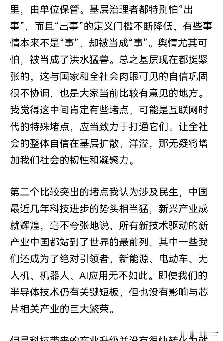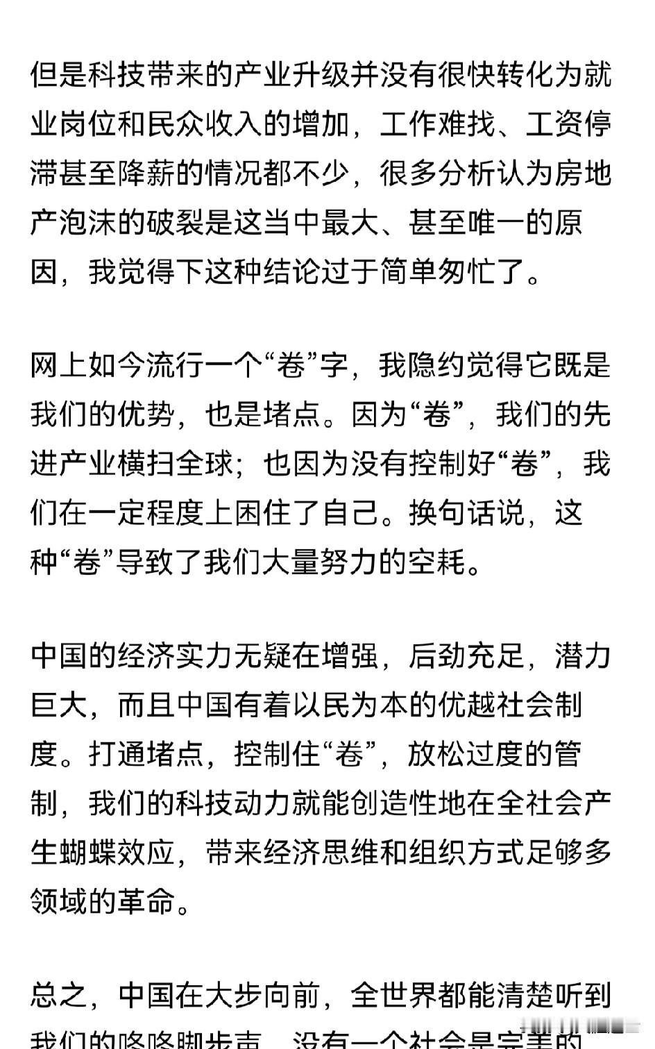 胡锡进同志下午发了一篇长文,大意是我们现在越来越自信,我们在经济、科技、军事、政治等方面越来越强大,逐渐与美国分庭抗礼,但国内基层组织和国民生活工作却不够自信。我十分认同老胡的观点,他现在更符合主流大众的价值观了,但却不够深入,我估计他也不敢太深入地谈这个。 至于他说的这两点,前者我没法谈,后者我是有切身体会的,“卷”只是表象,真正的本质是收入和分配不平衡,这是大家都知道的事,但很少有公众人士说这个,就连老胡这张大嘴也不敢。