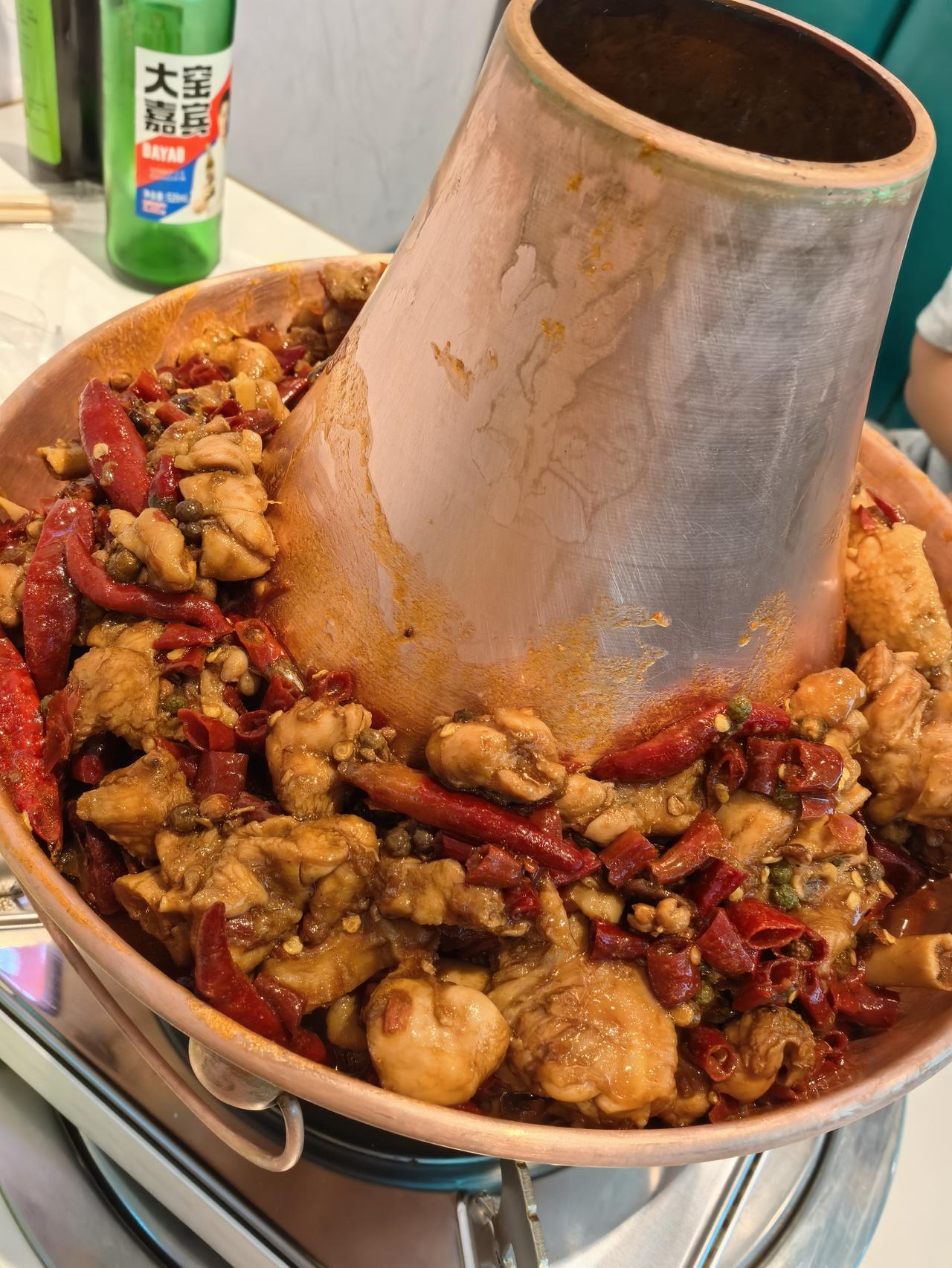 黄仁勋吃酸火锅展示盘子中的肉,没次看到他不是在吃东西就是在吃东西的路上。