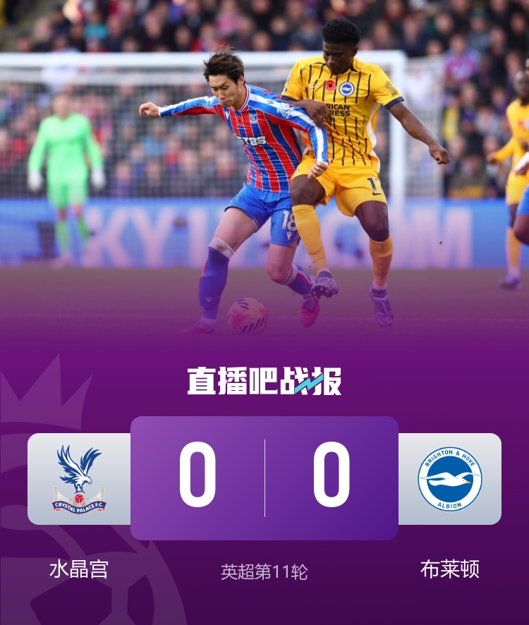 直播吧11月9日讯北京时间11月9日22:00,英超联赛第11轮水晶宫迎战布莱顿的比赛在塞尔赫斯特公园球场进行,上半场萨尔远射造险+失单刀,维尔布鲁根献神扑,下半场双方均无建树,最终水晶宫0-0布莱顿。