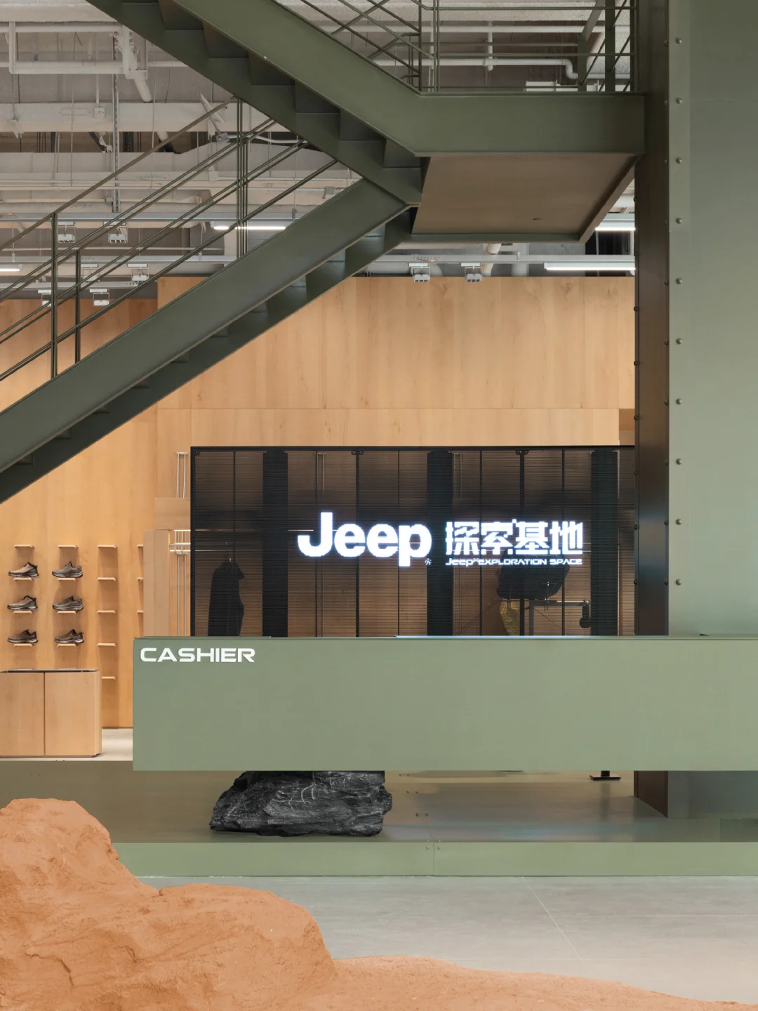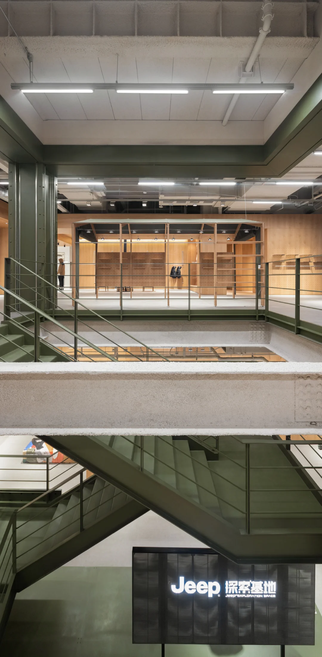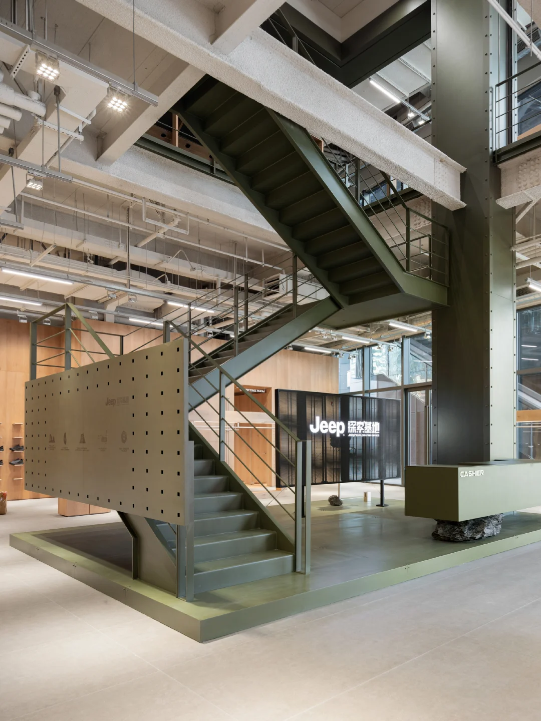 🏕️坐落于上海虹口,Jeep®品牌概念空间以“探索”为核心,从地貌语言、材质系统到空间路径的设计,构建出具象的体验场景。 设计团队将品牌精神拆解为三种探索维度:自然的、生活方式的、产品可塑性的。 🏕️ 入口是模拟Moab岩石拱门的结构,把科罗拉多高原的野性带进了上海的城市节奏中;军绿色金属楼梯、裸露的工业骨架、温润的原木陈设,构成了一场自然与工业的对话。 ♻️ 二层座椅使用了回收的帐篷、睡袋、冲锋衣手工制成,延续品牌对户外文化的尊重与再利用思维。这种从珠峰回收而来的材料为空间注入了真实的探险经验,也体现品牌对生态议题的长期关注。 🏕️ 空间不只是产品的展示场,更是连接用户与生活方式的节点。二层设有咖啡区、旅居产品区与开放式的文化活动空间,未来将承载更多自驾社群的交流活动,激发城市中“出发的念头” 🗺️⛰️ 项目:Jeep®上海探索基地 设计:摄影:云眠 设计灵感 空间设计 设计案例分享 商业空间 户外爱好者天堂 户外新风尚 探迹山野自在开场 商业空间设计 户外