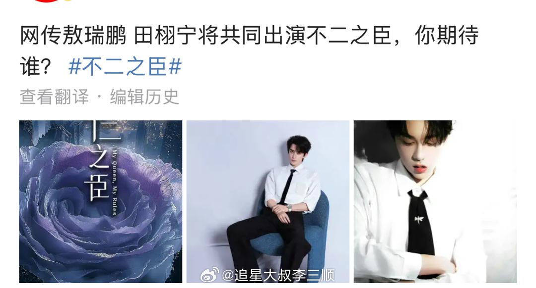 🍉敖瑞鹏 田栩宁将共同出演不二之臣?