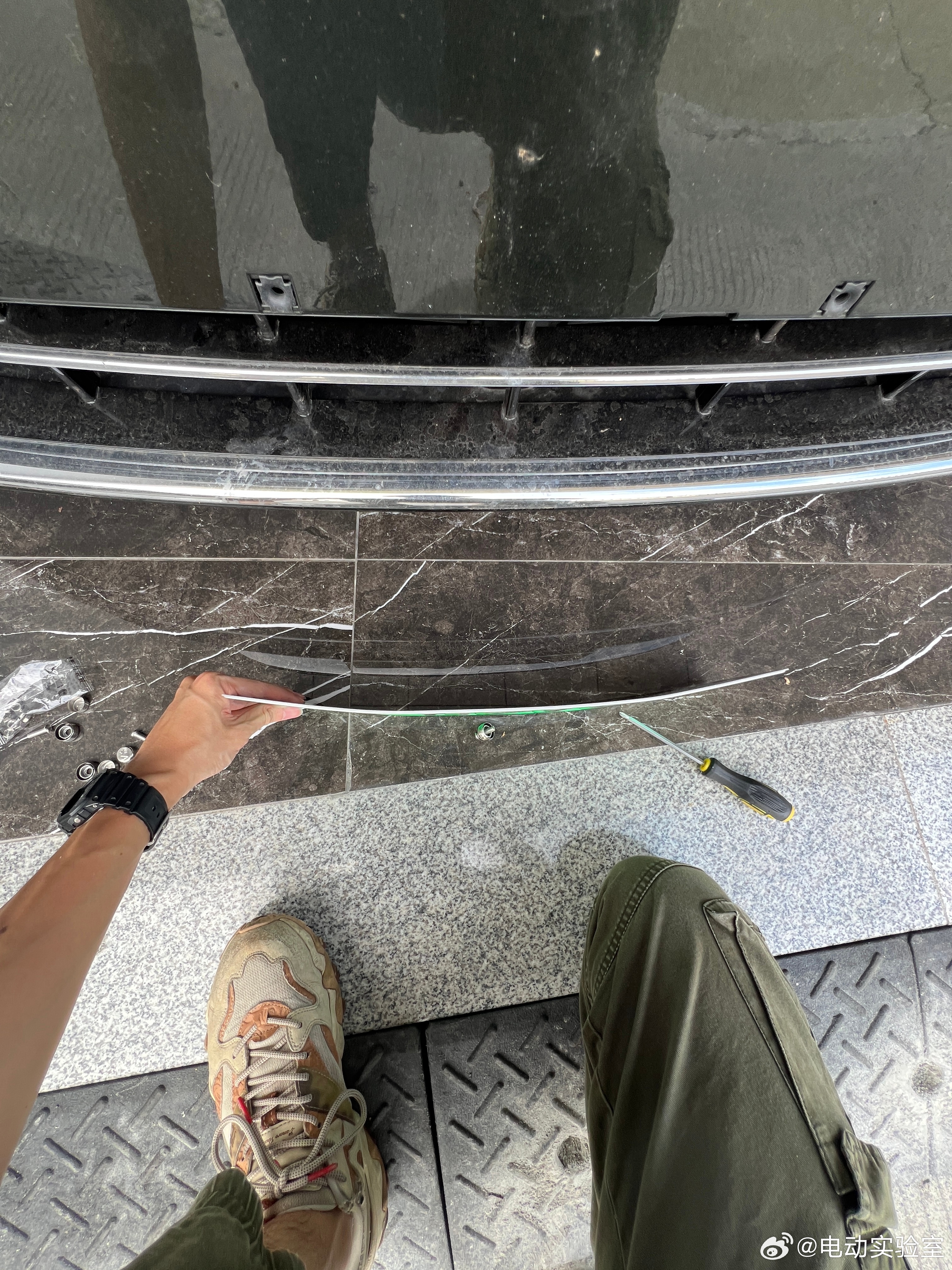 这里说一个上牌的“小技巧”,因为新能源车车牌会长一点,车子的保险杠往往又会带点弧度,如果直接上牌的话,车牌的两侧就容易翘起来(就像图2)。