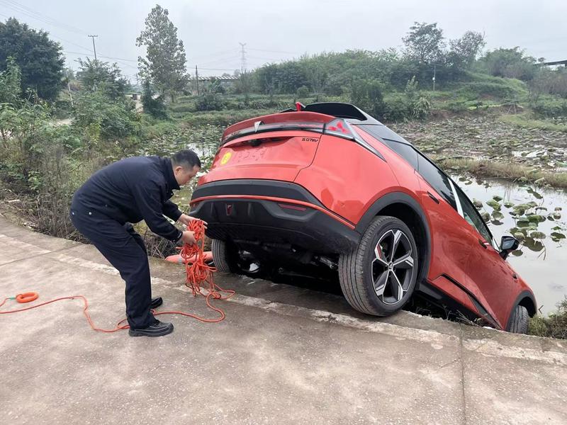 事发路段为乡村道路,狭窄且弯道较多,加之近期降雨影响,路面湿滑,给行车安全带来了隐患。民警到达现场后发现,事故车辆已冲入路边水塘,车身倾斜并悬挂在石坎上,且仍在缓慢向水田方向滑落,随时有完全倾覆的危险。