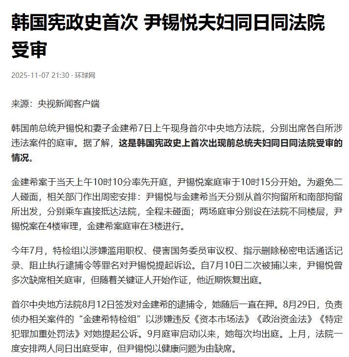2025年11月7日,将被载入韩国宪政史册,因为这一天,这位“韩国第一夫人”和这位“韩国总统”,在同一天、同一法院出庭,“先例”之多,在韩国史上也是头一遭。 尹锡悦瘦得脱了形,满头白发比卸任时老了十岁,金建希被俩狱警架着才挪得动步,三个月羁押瘦得脱了相,黑头发白了大半,哪还有半分当年北约峰会上戴名牌项链的风光劲儿? 谁能想到,这对夫妻曾经把权力握得有多紧。尹锡悦当总统时说一不二,金建希更是被骂“影子总统”。可这一切都从2024年12月开始变了,尹锡悦发布紧急戒严令,引发全国反对,到2025年4月就被弹劾罢免了总统职务。 7月,尹锡悦先被抓了,特检组告他滥用职权、指示删除秘密通话记录,还有阻止执行逮捕令等好几项罪名。才过了一个月,8月12日,金建希也被签发逮捕令,成了韩国宪政史上首个和总统丈夫一起被捕的第一夫人。 金建希的案子里,特检组拿出的证据桩桩件件都很扎实。最开始的是股价操纵案,早在2009到2012年,她还没和尹锡悦结婚的时候,就和人合谋把德意志汽车公司的股价从2000韩元炒到8000韩元,从中赚了420万元人民币。 特检组找到了她和证券公司职员的通话录音,里面清清楚楚能听到她对操纵股价的事知情,可她却说当时在读书没时间做这些。 让人议论的还有政治掮客明泰钧的反水。这个人自称是“尹锡悦家里的狗”,跟着夫妻俩多年,后来却向检方坦白了实情。他说尹锡悦刚当选总统,金建希就给他发了份名单,上面全是要“干掉”的本党议员,好让自己人上位。 明泰钧还透露,夫妻俩早商量好,上台后要平分人事权,连就职典礼上出现双彩虹,他都开玩笑说“是因为有两个总统”。他还给金建希做了58次定制民调,花了2.7亿韩元,全是免费的,这明显违反了政治资金法。 还有统一教送礼物的事。金建希一开始不承认,直到最近才通过律师道歉,说确实收了宗教人士全成培转来的两只香奈儿手袋,一只值6.3万元,一只值3.95万元,加起来10万出头。 可检方查到的不止这些,全成培后来翻供,说还有条31万元的格拉夫项链也送给了她,虽然金建希退了些包和鞋,但项链已经被检方扣下来了,序列号都对得上。 这案子现在还没判,可关注度一点儿没降。之前9月安排过一次同日出庭,尹锡悦说身体不好没来,这次总算露面了。金建希最近也以健康恶化为由申请保释,但还没消息。 有意思的是,已经有1.2万韩国民众集体起诉他们,说尹锡悦的戒严令侵犯了大家的权利,金建希是共犯,每人要索赔518元。 法院之前已经判过一次,认定戒严令确实给民众造成了精神损害,尹锡悦不服上诉了,可这事儿已经成了韩国人茶余饭后的话题。 从当年风光无限的总统夫妇,到如今需要狱警搀扶、白发苍苍的被告,这场庭审就像一面镜子。虽然案子还没结果,但大家都看明白了一个理:特权再大,也大不过规矩。