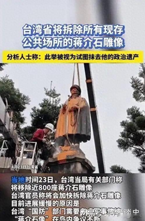“台独”党“去蒋化”,蒋市长束手旁观! 50年代,蒋某人盘锯在一个小岛上,拿民众的血汗钱,给自己建造了900多座雕像! 哪个时候,蒋某人在岛内一手庶天,老百姓敢怒不敢言! 后来,只怪蒋某人的儿子看错了人,把大权交给一个臭名昭著的“台独”分子李登辉手中。 从此,台湾已不再是蒋某人的天下。 如今“台独”当道!为了一个己私利,不惜一切手段,把蒋某人从岛上“抹”去。 虽说蒋某人的曾孙,如今在台湾做了市长,但由于其骨子里流淌着蒋家血脉,对对岸心存疑虑?所以,面对“台独”党这一举措,只是束手旁观。 (台湾地区“内政”部门编列1100万新台币预算,计划拆除全台900多座蒋介石铜像,每座补助10万新台币)。