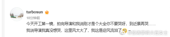 孙俪导演我这是迎风泪孙俪开工第一镜就是哭戏 导演叮嘱近景再释放情绪,孙俪连忙解释全景流泪缘由:风太大,是迎风流泪啦。
