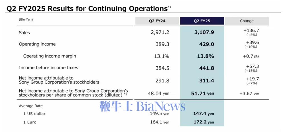 11月11日,索尼集团发布2025财年第二季度财务业绩。财报显示,第二财季经营利润4289.7亿日元,预估3921.6亿日元,同比增长10%。