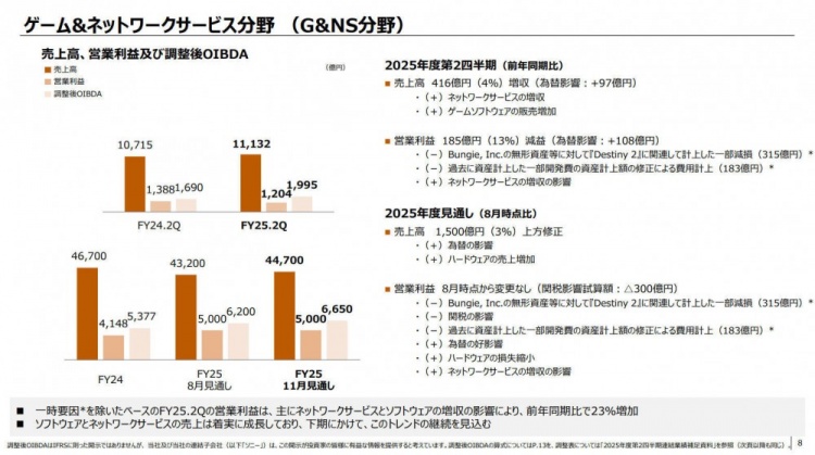 该公司的游戏与网络服务部门收入达到11132亿日元,同比增长416亿日元;营业利润为1204亿日元,同比下降185亿日元。