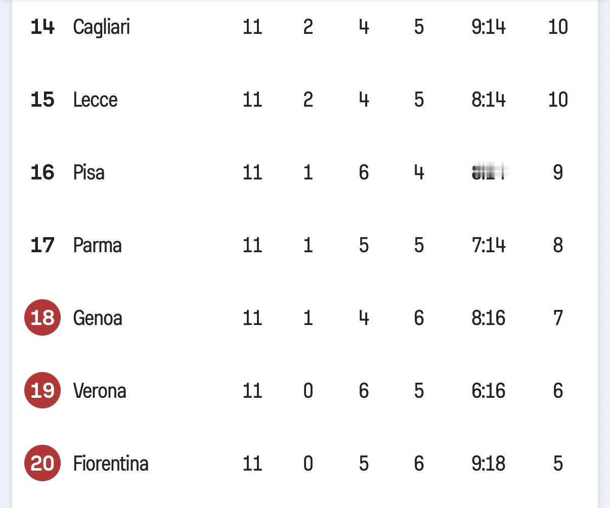 14-20保级区,图三:7个队,米兰踢了4个,2客2主,成绩2胜2平。