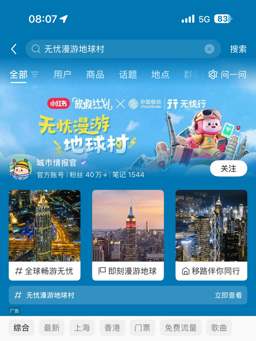 彩蛋福利:即日起-10.18在首页顶部的搜索框里输入无忧漫游地球村,进入H5活动页面参与活动页打卡许愿活动,还可以领取丰厚奖品!
