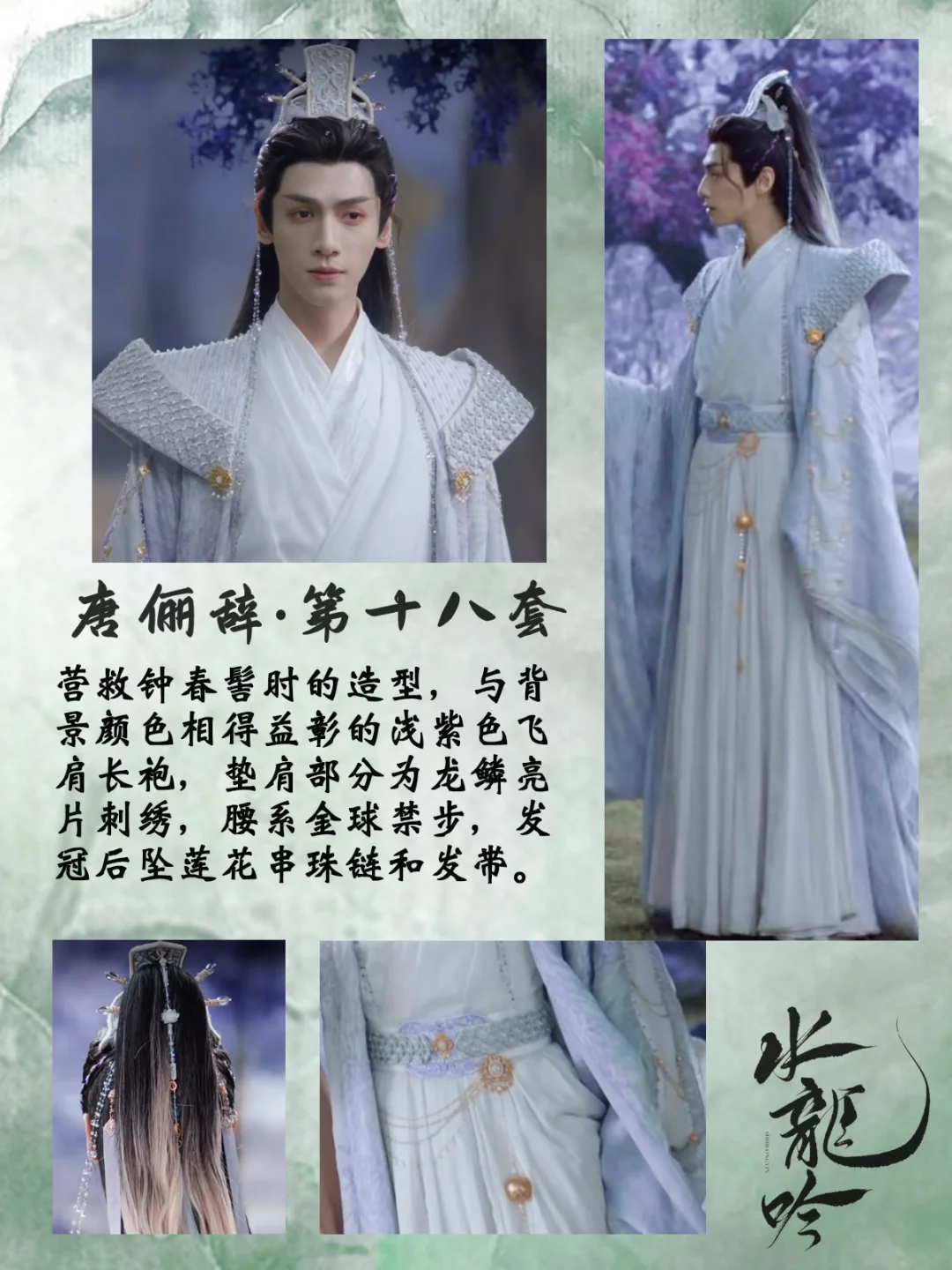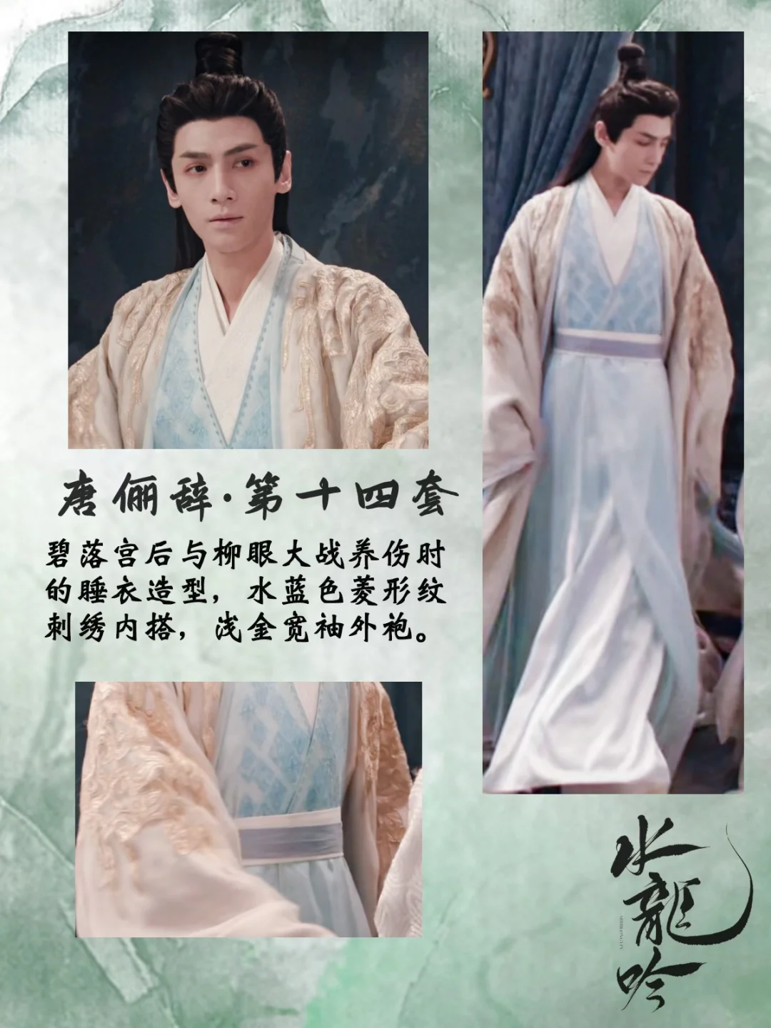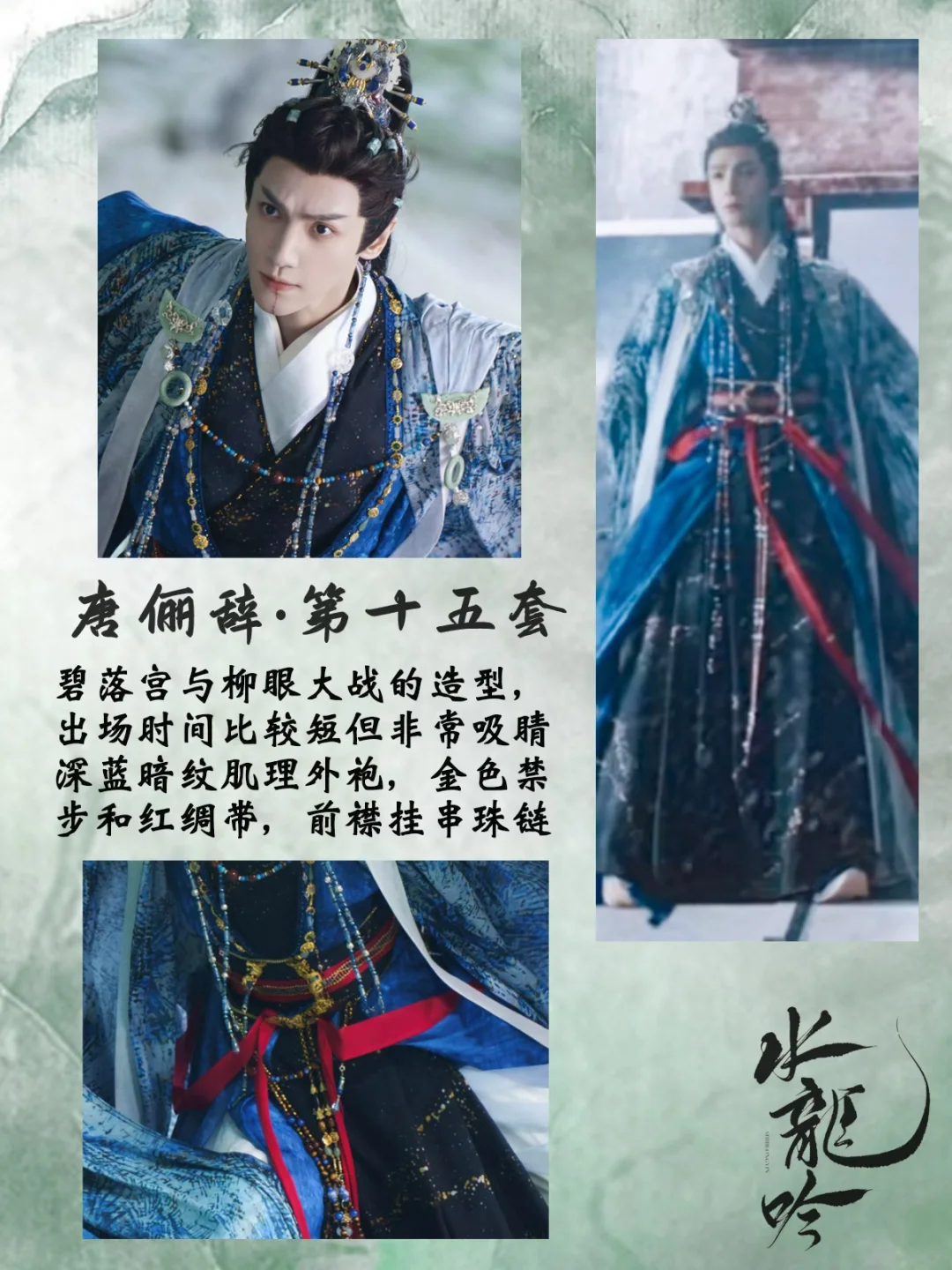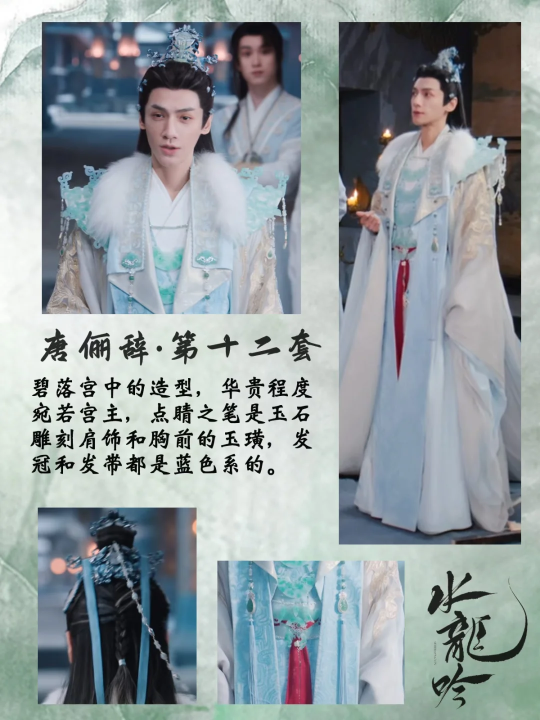 打一场架换一套衣服,每套都重工华丽又别具特色,简直是视觉盛宴[哇R][哇R] 中国传统元素拉满了,是怎么做到每套都像是要登基[偷笑R]碧落宫里他仿佛才是宫主! 还有第16套衣服上的书法刺绣纹样,太会设计了,完全没有落入俗套,与琉璃碧玉冠相得益彰 💡后续会专门出一篇笔记整理唐狐狸的精美发冠,等待我持续更新吧