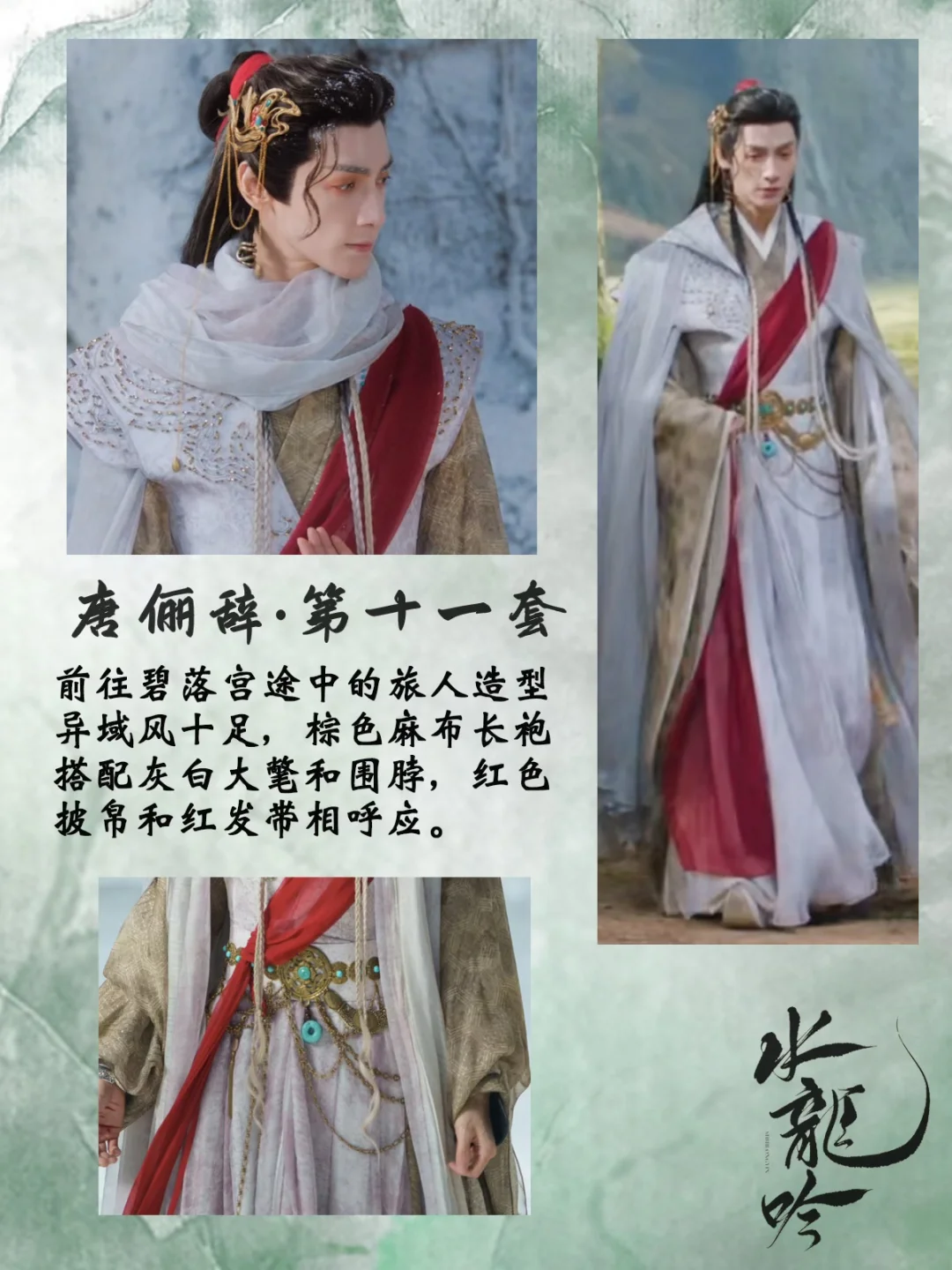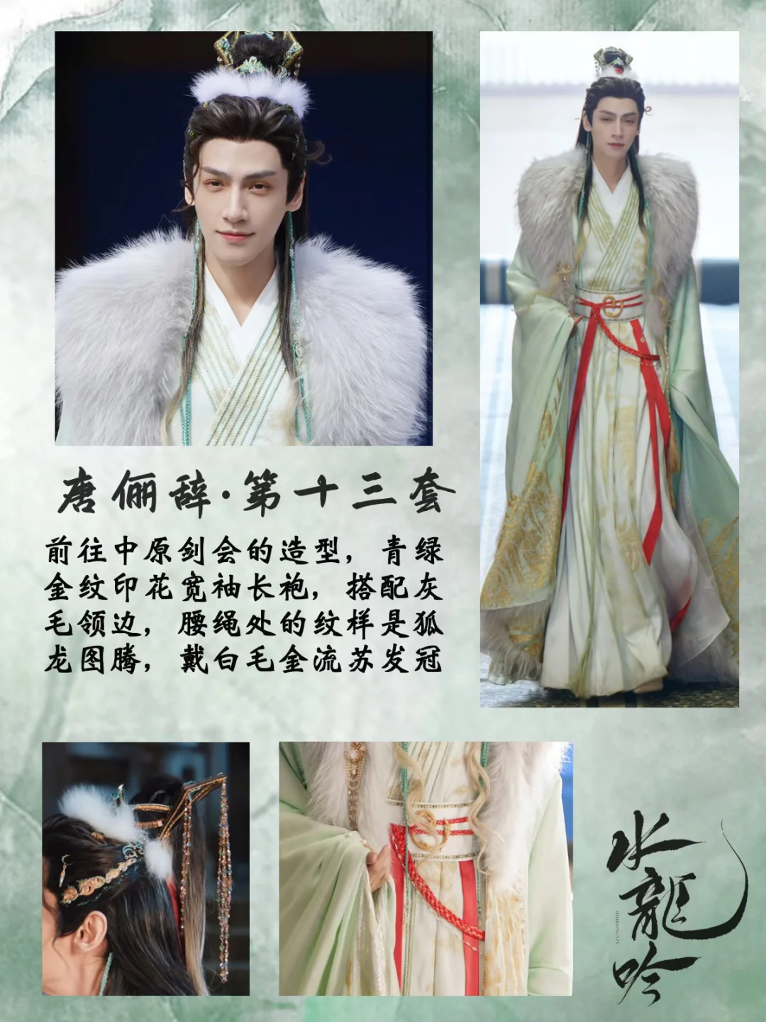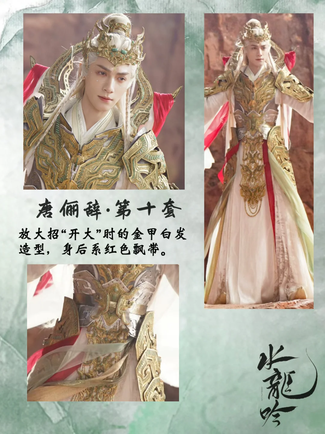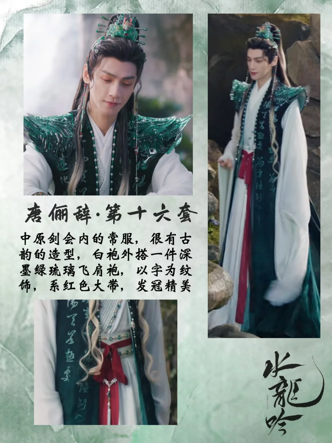 打一场架换一套衣服,每套都重工华丽又别具特色,简直是视觉盛宴[哇R][哇R] 中国传统元素拉满了,是怎么做到每套都像是要登基[偷笑R]碧落宫里他仿佛才是宫主! 还有第16套衣服上的书法刺绣纹样,太会设计了,完全没有落入俗套,与琉璃碧玉冠相得益彰 💡后续会专门出一篇笔记整理唐狐狸的精美发冠,等待我持续更新吧