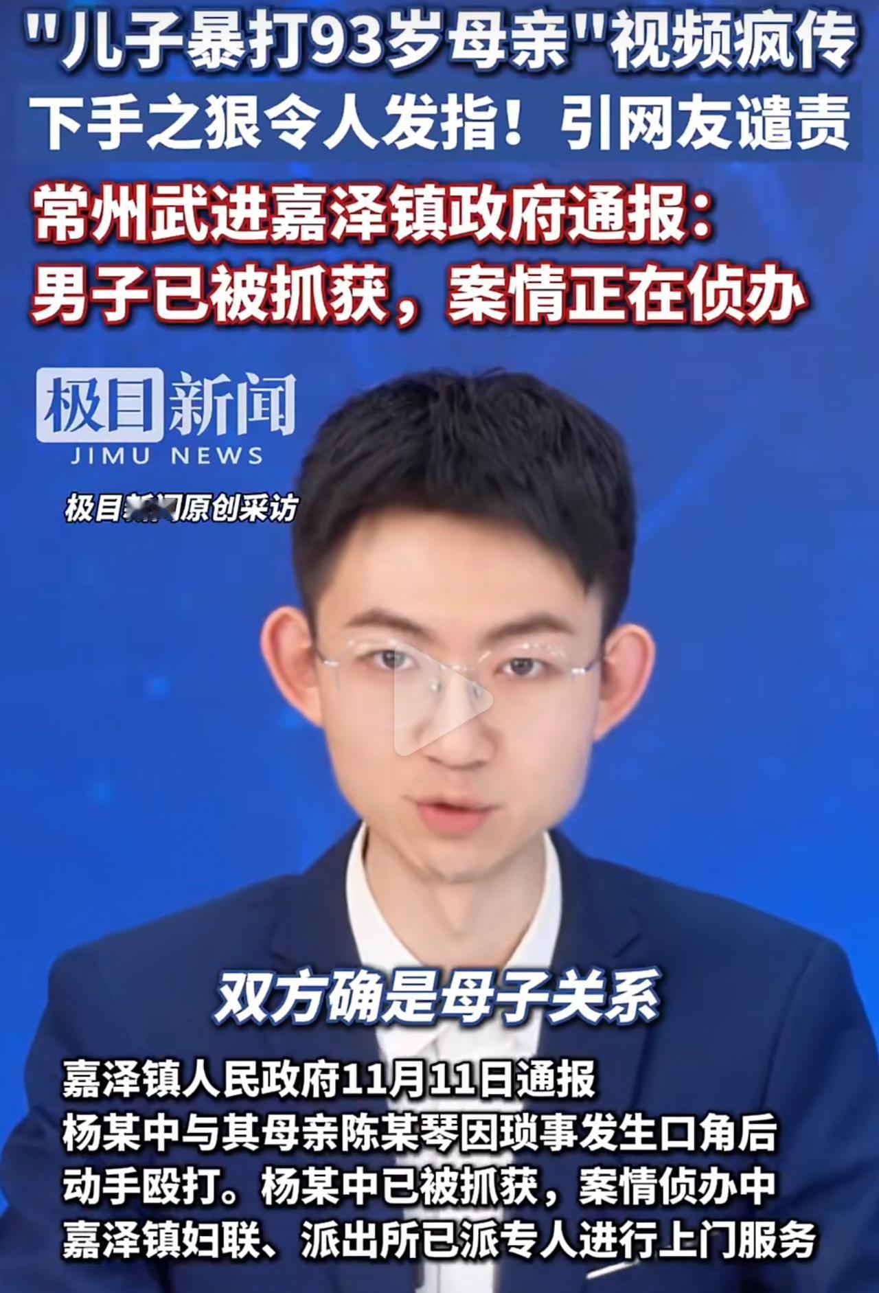 11月10号江苏常州那档子事,监控拍得清清楚楚!杨某中就因为点鸡毛蒜皮的破事,跟老母亲拌了两句嘴,抬手就扇耳光,一把薅住老人的花白头发,硬生生按在地上,拳头噼里啪啦往身上砸!老人疼得嗷嗷直叫,踉跄着躲进厨房,他还不依不饶,跟着追进去接着打,那场面看得人牙根直痒痒,火气一下子就窜到头顶了! 更让人寒到心坎里的是,曝光监控的人说,这种打骂压根不是头一回,是“家常便饭”,这次实在是忍无可忍,才敢把监控发出来报警!你想想,老人都93岁了,本该舒舒服服享清福,结果天天活在亲生儿子的拳头底下,夜里怕是闭眼都怕,那得有多绝望啊? 好在警方很快就把这坏人抓了,妇联和政府也上门照顾老人。可我越想越堵得慌:“养儿防老”喊了一辈子,怎么就养出这么个白眼狼?长期虐待亲妈,这哪是家务事,是实打实的犯罪! 赡养老人不光是义务,更是良心!就算有天大的矛盾,动手打生你养你的亲妈,就该永远被人戳脊梁骨!你觉得该怎么严惩这种不孝子?评论区聊聊!常州父母 常州老太 不孝子