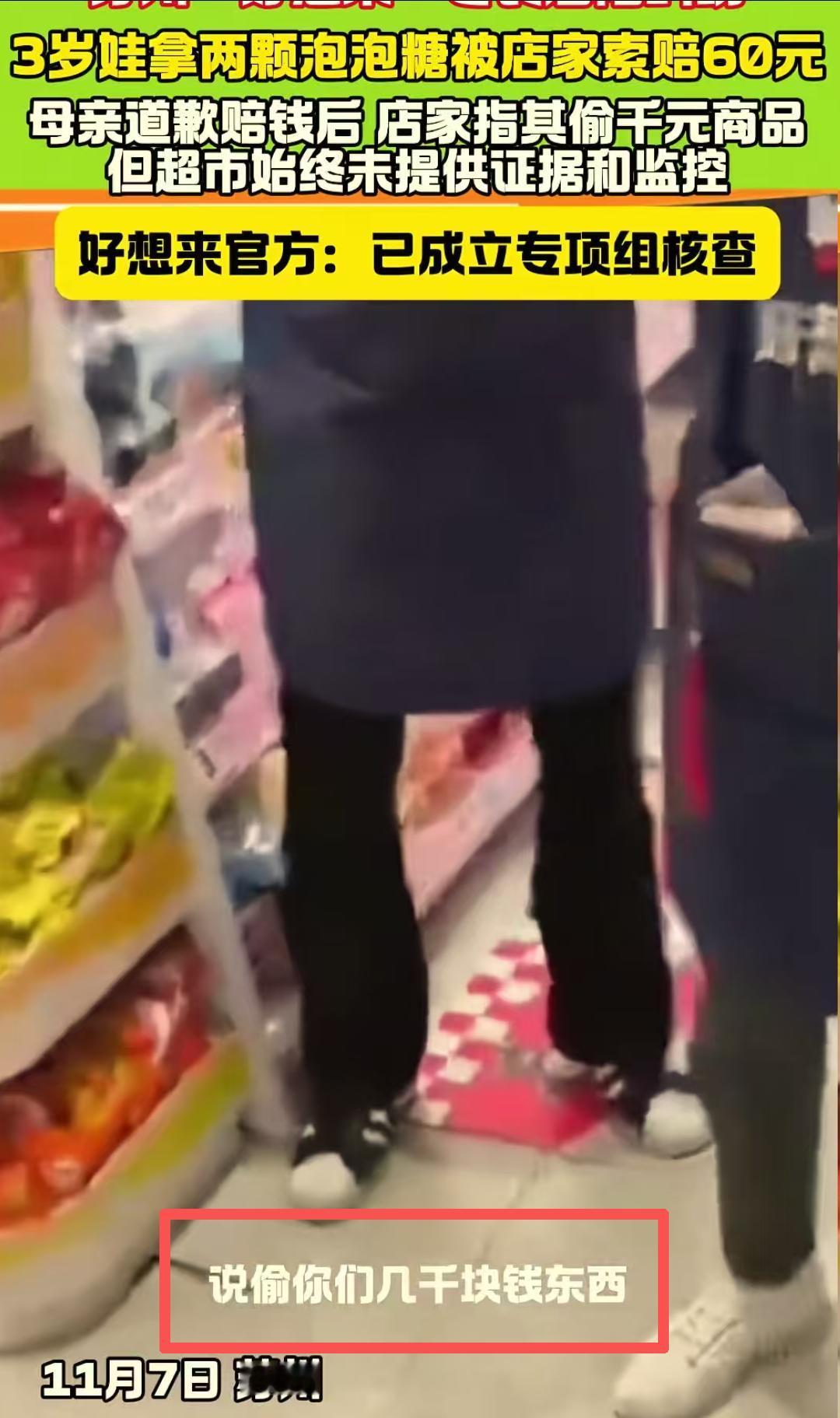 一个刚脱尿不湿的孩子,竟然能偷超市几千元的零食? 3岁的明明和妈妈逛超市,结账出门后,妈妈发现孩子手里多了一个泡泡糖。 于是,妈妈带着他赶紧返回想把泡泡糖的账给结了。 万万没想到的是,超市工作人员竟认为,孩子是偷东西的,竟然要求高价赔偿。 而且,他们振振有词,发现这样的情况,只要发现一起,就要承担一部分超市丢失货物的损失。他们要求明明妈妈掏60元。 看到一群人虎视眈眈的样子,胆小的明明妈妈害怕了,提出可以拿出和上一个买单人同样的价格,将此事化解。 于是就掏了60元,把此事翻篇,离开了商家。 可消息传到家里,明明的爷爷和爸爸不干了,就到超市问个究竟。 更离谱的是,这次超市方又再次加码了,说是孩子一共偷了他们6000多块钱的零食,要求进行等价赔偿。 爸爸就直接说:“你可以把监控调出来,如果孩子确实偷了,我就把钱掏了。”他还放言,只要拿出监控,100倍甚至1000倍都可以赔偿。 这下,超市的人都傻眼了,因为他们提供不了这样的视频。 作为常人来讲,一个3岁的孩子,他就是到超市了,店员拿给孩子一个糖果哄哄孩子不也很正常的事吗? 现在超市的零食区,很多都可以提供免费试吃服务的,只要顾客觉得符合自己的口味了,直接就买了。 如果都照这家超市这样的做法,将一个幼童当成小偷,估计就太可笑了吧! 有网友就说,看到这样一群吵吵嚷嚷、蛮横无理的员工,而且店里屡屡丢东西,不会是这些人监守自盗吧! 有很多时候,家长教育孩子不要拿别人的东西,如果拿了就要及时还回去,赔偿道歉,赔偿损失。 这样的出发点是给孩子讲做人要诚信的道理,给孩子上上课。 万万没想到的是,这位妈妈给孩子上课没上明白,倒是让商家给上了一课。 这样的商家,如此素质的员工,您还要继续支持吗?