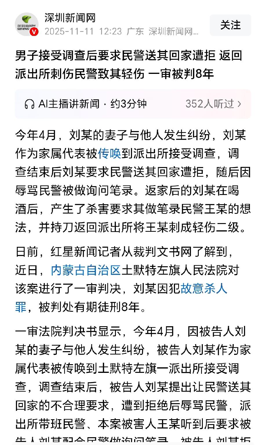 持刀刺警!内蒙古自治区土默特左旗,男子作为家属代表,被派出所传唤接受调查。结束后,因天色已晚,距离还有点远,男子提出让民警送他回家,却遭到拒绝。回家后,男子借酒消愁,竟然生起了报复之心,当天晚上他持刀把民警刺成轻伤。法院审理后,直接认定男子构成故意杀人,判决有期徒刑8年。有人却觉得男子的要求合情合理,判八年太重了。 男子刘某没想到,只是为了发泄心中的不满,结果因为一时冲动,让自己身陷囹圄。 事情要从一场家庭纠纷说起。刘某的妻子和别人起了冲突,作为家属代表,他被当地派出所传唤过去接受调查。 配合警方工作本是公民的义务,刘某也没多想,老老实实去派出所做了笔录、回答了相关问题,全程都还算配合。 等调查全部结束时,天色已经完全黑透了,想到自己家离派出所还有不短的距离,刘某便盘算着让民警送他回家。 于是,刘某向给他做笔录的民警王某提出请求,让王某开车送他一程,没想到,为人民服务的民警王某竟然拒绝了他。 原本就配合调查跑了大半天有些疲惫,现在这么合情合理的要求还遭到拒绝,刘某心里顿时涌上一股火气。 为了发泄心中的气愤,他忍不住对着民警说了几句难听的话,言语间带着不少辱骂的意味。 不料,民警见刘某辱骂执法人员,也没惯着他,当即决定对他的辱骂行为又做了询问笔录。 这一下,刘某更是火上浇油,心里的委屈和愤怒一股脑地涌了上来,只觉得自己受了天大的委屈,对拒绝他的民警王某更加记恨。 当天晚上9点左右,刘某回家后决定借酒消愁,从家里拿出白酒,独自一人拿碗喝了起来。 酒精上头后,原本就激动的情绪变得更加失控,刘某心里的怨气渐渐扭曲成了报复的念头,冲动战胜了他的理智。 当晚12点20分左右,刘某在自家厨房里翻找了一把长长的水果刀,还有两把短刀。 他把长水果刀别在身后的裤腰带上,两把短刀揣进了右边的裤兜里,随后骑上电动自行车,直奔派出所。 到了派出所门口,刘某发现值班室里人太多,没找到合适的下手时机,只能在门口蹲守,等待民警王某下班,或者人少的时机。 功夫不负有心人,终于在等待了一段时间后,刘某瞅准了一个机会,猛地冲进派出所,拔出事先准备好的刀,朝着王某就刺了过去。 王某猝不及防,被刘某刺伤,好在反应及时,没有造成生命危险。 经过司法机关鉴定,王某的伤情构成轻伤二级。 事后,刘某很快被警方控制,还被检察机关以故意杀人罪(未遂)提起公诉。 《刑法》第232条规定,故意杀人的,处死刑、无期徒刑或者十年以上有期徒刑;情节较轻的,处三年以上十年以下有期徒刑。 已经着手实行犯罪,由于犯罪分子意志以外的原因而未得逞的,是犯罪未遂,可以比照既遂犯从轻或者减轻处罚。 刘某因不满被拒和受批评,产生了杀害民警王某的明确报复念头,而非单纯伤害意图。 而且,他事先准备三把刀,深夜蹲守派出所等待下手时机,主动冲向王某实施持刀刺杀,属于有预谋的杀人行为。 虽然结果仅造成王某轻伤二级,但也属于刘某意志以外的原因未得逞,构成犯罪未遂。 法院审理认为,刘某的行为构成故意杀人罪,而且属于袭警,社会危害性较大。 考虑到犯罪未遂,法院最终判决刘某有期徒刑8年。 判决结果公布后,很多人觉得判决有点重,刘某配合调查后,晚上要求民警送回家,这合情合理,民警多帮衬一把也没什么。 还有人认为,派出所民警当时要是能好好沟通,而不是直接拒绝,也不会激化矛盾,民警本身也有一定的过错。 但也有人认为,持刀刺警都是严重的违法行为,挑战执法权威,必须严惩。 其实,民警拒绝送刘某回家不构成重大过错。 《治安管理处罚法》第50条规定,阻碍国家机关工作人员依法执行职务的,处警告或者二百元以下罚款;情节严重的,处五日以上十日以下拘留,可以并处五百元以下罚款。 同时,我国执法实践中,民警核心职责是维护社会治安、办理案件,“护送配合调查人员回家”并非法定强制义务,仅属于特殊情况下的便民协助。 刘某作为具备完全行为能力的成年人,完全可以通过网约车、出租车等合法方式返程。 民警有权基于执法资源、工作安排等因素拒绝,该拒绝行为不违反法律规定,更不构成过错。 相反,刘某因被拒而辱骂民警,已涉嫌阻碍国家机关工作人员依法执行职务,民警对其辱骂行为制作询问笔录,属于合法履职。 即便民警在沟通中可能存在态度不够温和的情况,也不能成为刘某后续持刀刺警的免责理由。 综上,刘某因为自己的冲动行为被判刑,完全是咎由自取,不值得同情。
