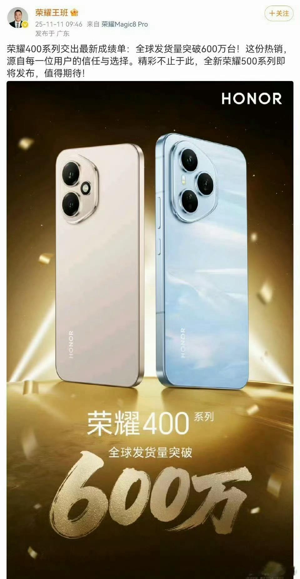 肖战代言荣耀400系列,全球发货量破600万台,狂揽至少180亿➕销售额,顶级影响力号召力太能打了!不愧是财神爷!更惊喜的是,荣耀500系列也即将发布了。
