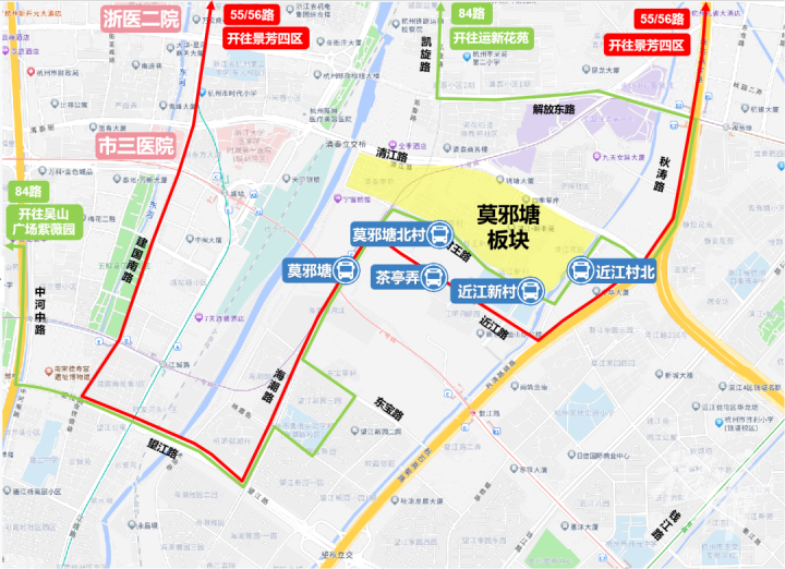 55、56路调整后将行经近江路、海潮路后通过望江立交至章家桥、浙医二院一带,覆盖莫邪塘板块的多个小区。该板块的居民可在“莫邪塘”或是“茶亭弄”站乘坐55、56路,前往市三医院、浙医二院、众安桥、天水桥、西湖文化广场等地。