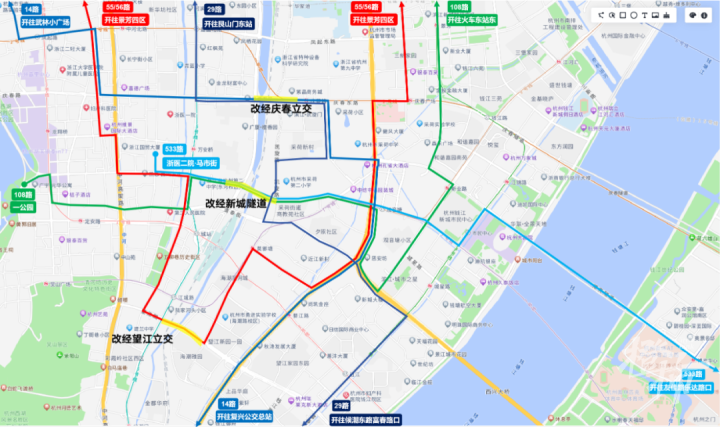 改走新城隧道的线路:108路(仍可继续到达市三医院、一公园等热门地不变)、533路(仍可继续到达浙医二院)、8210路、8300路