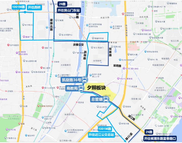 同时,杭州公交对在该板块行驶不受施工影响的1001M路也进行了发车间隔的加密,主要方便了商教苑、夕照新村居民可以顺利前往省青春医院、浙医一院、庆春路世纪联华等地。