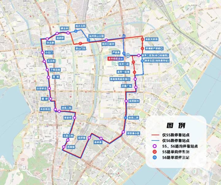 以莫邪塘板块为例,若仅对线路进行简单分流,该片区居民需步行1公里才能抵达邻近公交站。杭州公交关注到这一实际困扰,为切实便利该板块居民出行,自11月22日起,将调整55、56路部分线路走向。