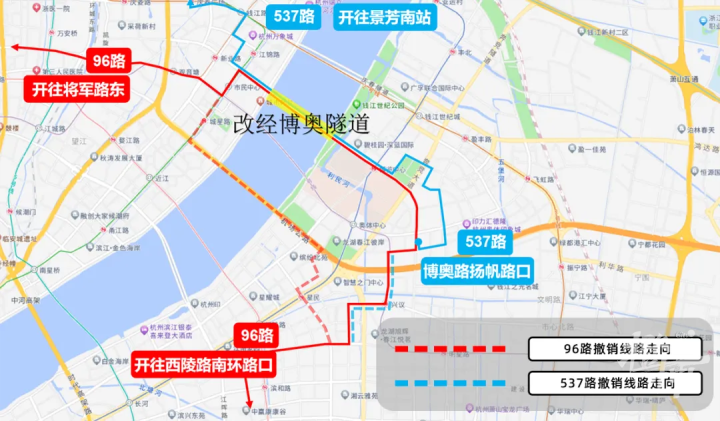 此外,原在滨江物联网总站、浙水大厦、矽力杰大厦、兴议地铁站乘坐537路的乘客,需改乘96路出行。