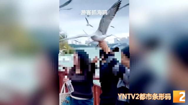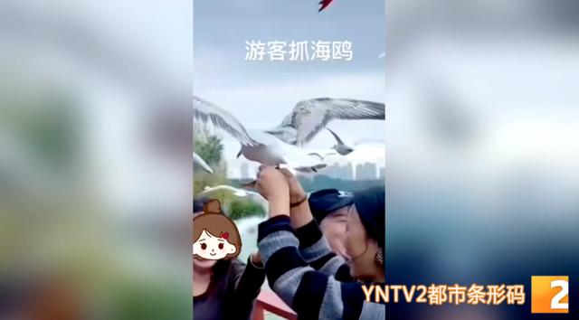 目击者曾女士:“我在海埂大坝上看到,有两名游客在拍照,她们抓着红嘴鸥”。