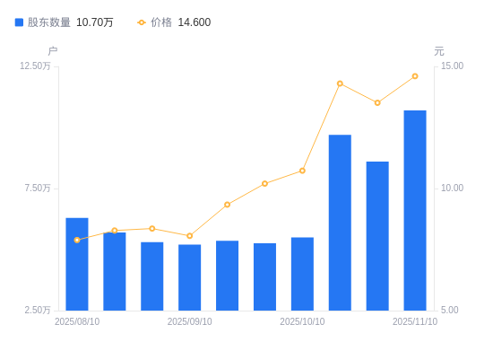 日期A股户数(户)流通A股户均持股数(股)户均持股市值(万元)2025-11-1010700020883.1230.492025-10-318600025982.4835.102025-10-209700023036.0232.942025-10-105500040627.1643.592025-09-305256142512.3943.362025-09-205360041682.8738.932025-09-105200042965.4234.632025-08-295300042154.7535.242025-08-225700039104.0932.382025-08-106300035379.8927.91