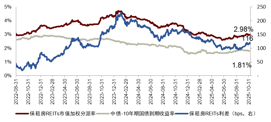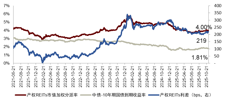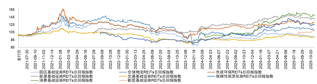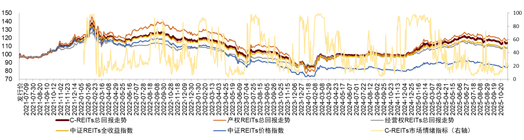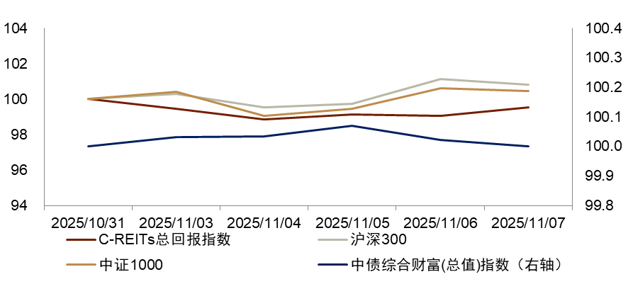 注:1)为方便对比,我们对中证REITs价格指数及全收益指数进行了起始日期标准化处理;2)数据截至2025年11月7日