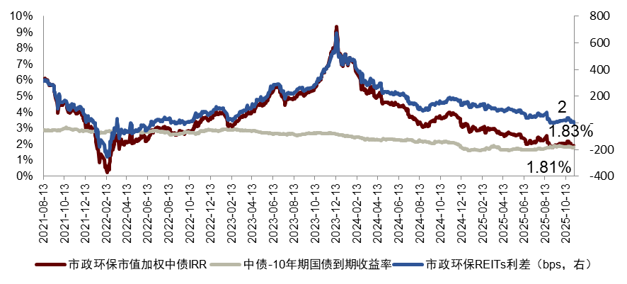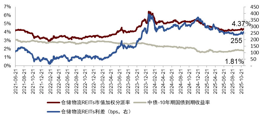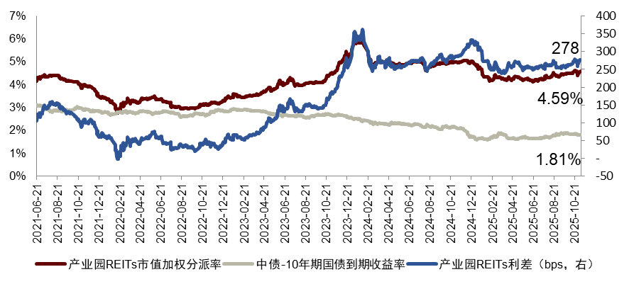 估值比价压力部分缓解。经营权REITs市值加权中债IRR与十年期国债到期收益率利差环比收窄1bps(其中市政环保环比-8bps至2bps)。产权REITs市值加权年化分派率与十年期国债到期收益率利差环比走阔2bps(其中产业园环比+10bps),同时产权REITs分派率与中证红利指数股息率的负息差环比收窄18bps至-23bps,主因中证红利指数股息率下行14bps。
