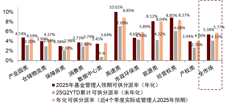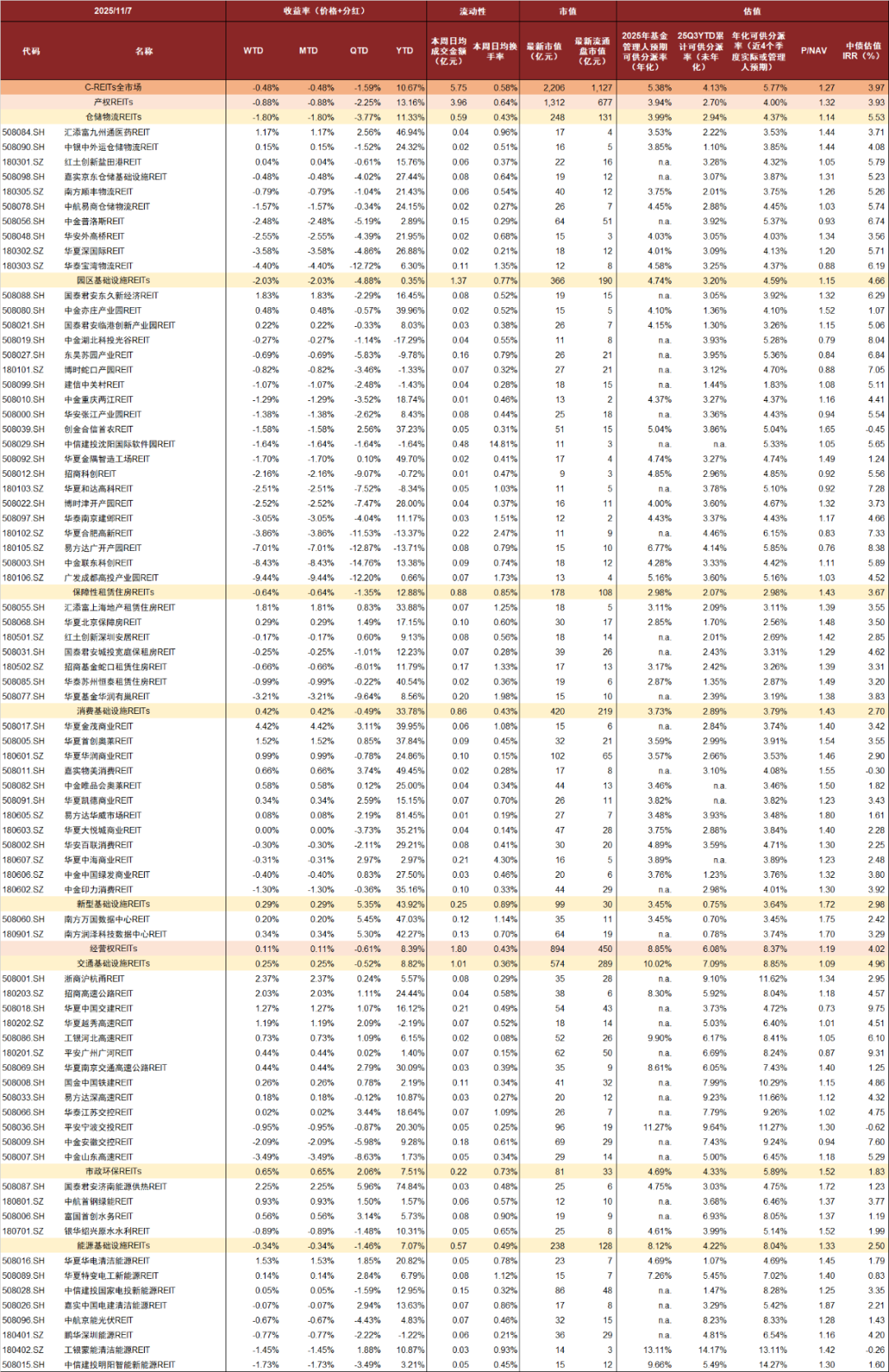 注:1)2025年基金管理人预期可供分派率(年化)基于各REITs招募书中的管理人预测2025年度可供分配金额年化计算;25Q3YTD累计可供分派率(未年化)基于各REITs2025年三季报披露的本年累计可供分配金额计算,未年化;年化可供分派率(近4个季度实际或管理人预期)的计算中,满4个历史季报的REITs基于其最近4个季报的累计可供分配金额计算,对于未披露满4个季报的REITs,除南方润泽科技数据中心REIT和中信建投沈阳国际软件园REIT按招募书中的管理人预测2026年度可供分配金额计算外,其他REITs均按招募书中的管理人预测2025年度可供分配金额计算,均按天数年化;C-REITs全市场、产权类REITs及经营权类REITs分派率采用总市值加权法计算;2)未发布2025年中报的REITs采用拟募集金额测算NAV,已发布2025年中报的产权REITs项目的NAV测算方式为(期末基金净资产+资产评估公允价值-投资性房地产-等同于发行溢价部分的商誉(如有))/发行份额,除华泰江苏交控REIT以其2025年中报披露的期末基金份额公允价值参考净值计算外,已发布2025年中报的经营权REITs项目的NAV均以账面净资产价值计算;3)C-REITs全市场、产权REITs、经营权REITs及各板块REITs收益率为模拟流通市值加权总回报指数的收益率,单个REIT的收益率则基于不复权价格涨跌幅以及分红收益加总计算;4)数据截至2025年11月7日