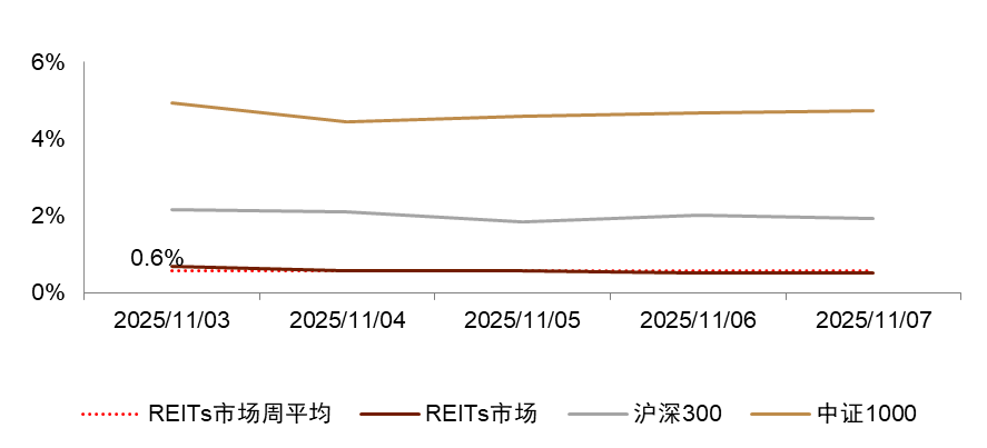 本周(2025年11月3日至11月7日)中证REITs全收益指数和价格指数均下跌0.40%。市场总市值收于2206亿元,环比上升0.01%,若剔除新上市项目则为环比下降0.48%。