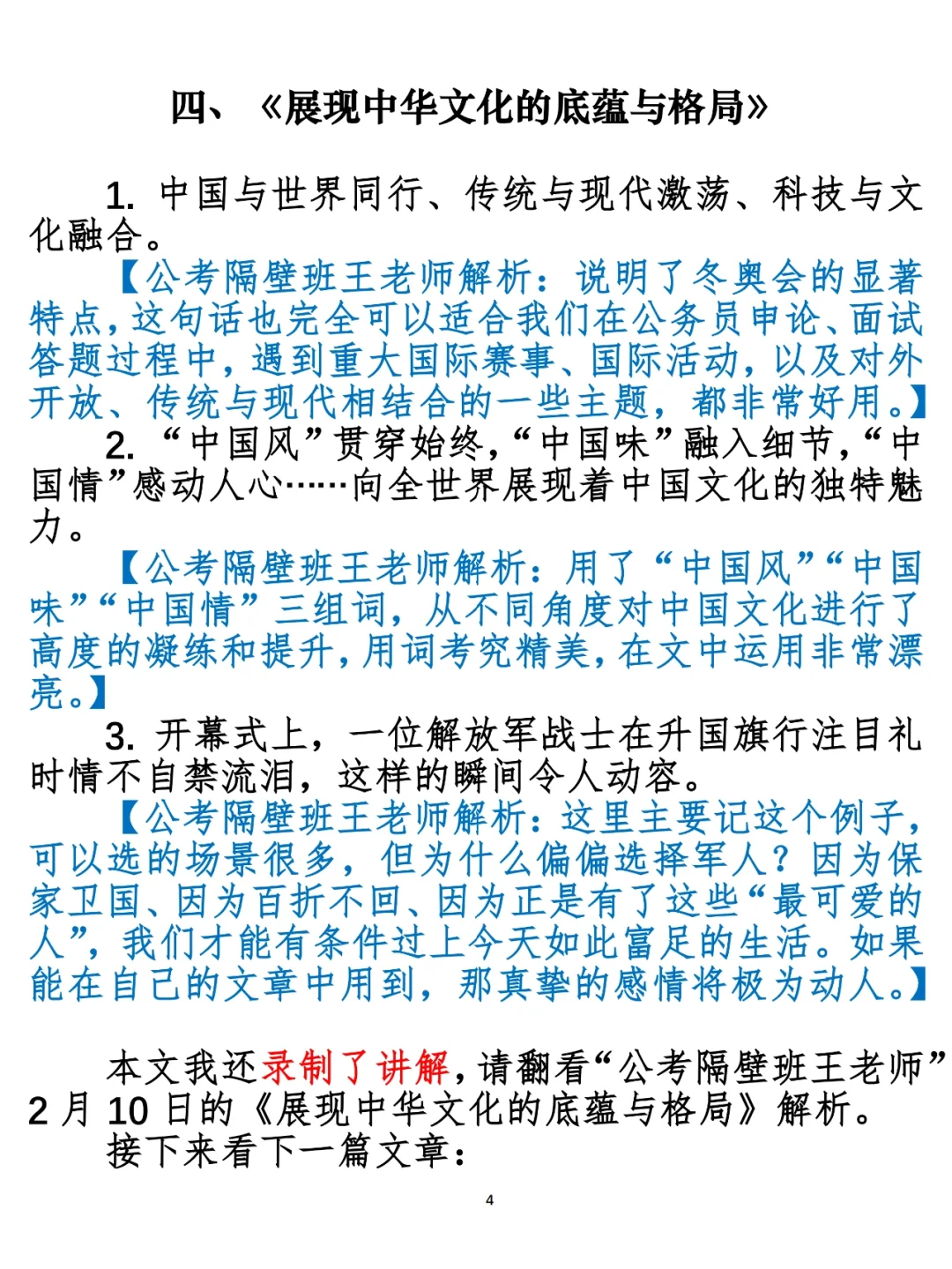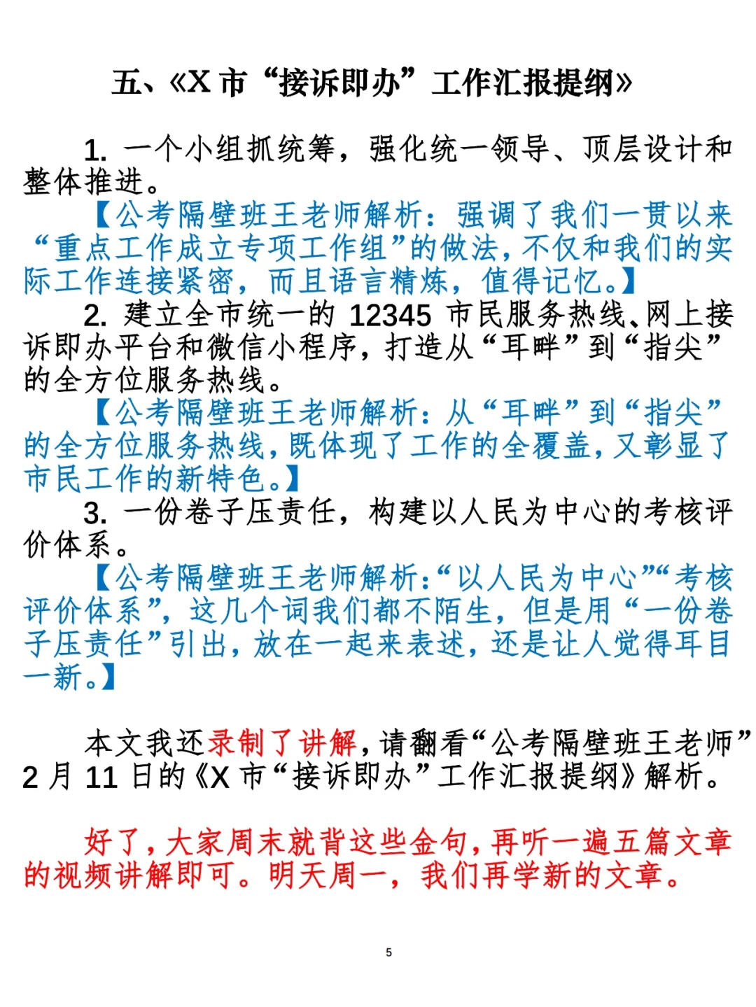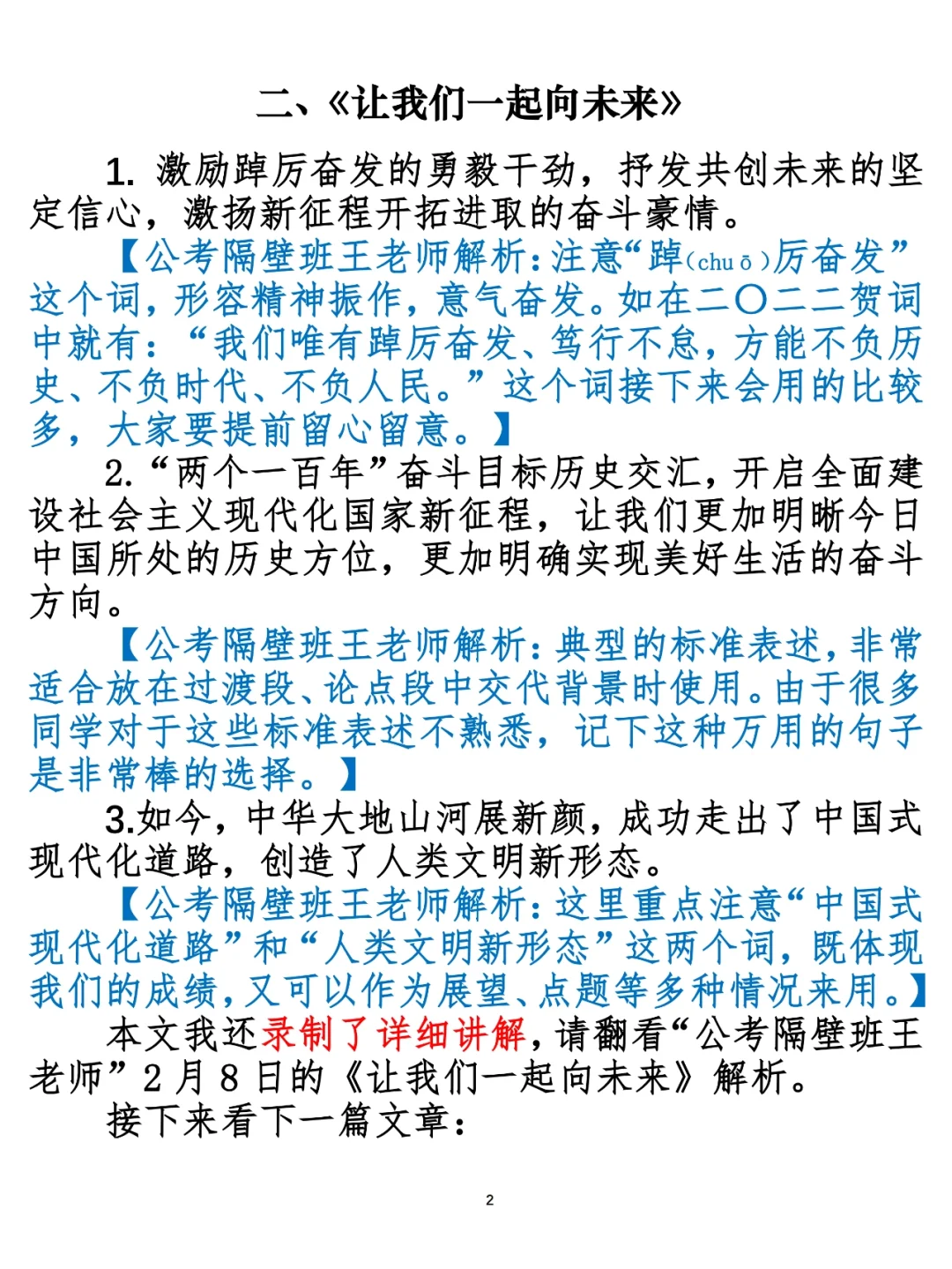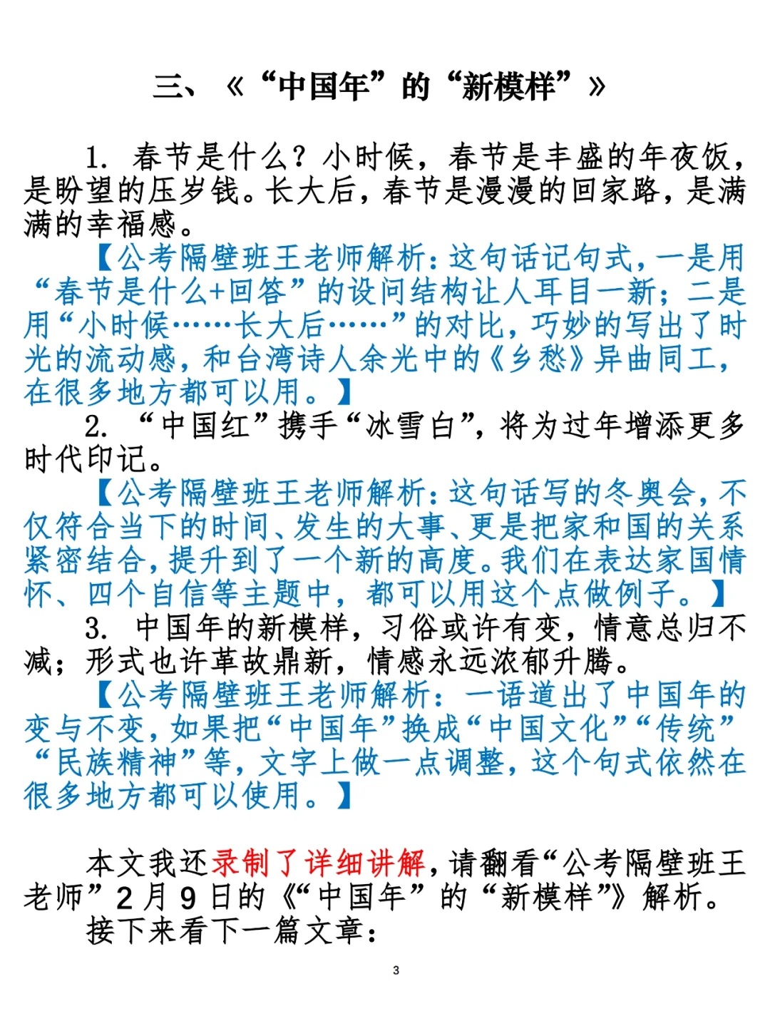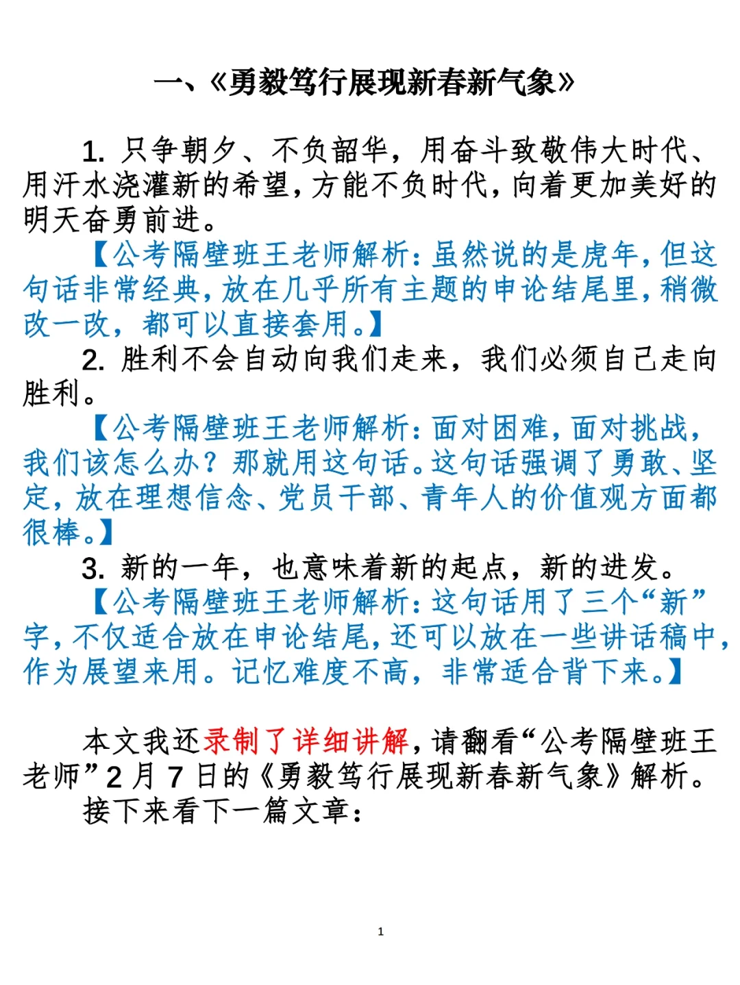 本周我们又学习了5篇人民日报申论范文,分别为: 1.《勇毅笃行展现新春新气象》(2.7日,周一) 2.《让我们一起向未来》(2.8日,周二) 3.《“中国年”的“新模样”》(2.9日,周三) 4.《展现中华文化的底蕴与格局》(2.10日,周四) 5.《X市“接诉即办”工作汇报提纲》(2.11日,周五) 今天,我们就总结学习一下里面的“万能金句”。 每篇文章的详细讲解请回顾本周视频。 ⭐️ ⭐️ ⭐️ ⭐️ ⭐️ ⭐️ 这里是公老隔壁班王老师独创的“每天半小时 申论80分”抄写团,欢迎加入我们!