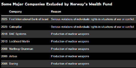 现行的道德准则禁止投资生产核武器或其零部件的企业。但与此同时,挪威政府加大国防开支,包含向BAESystemsPlc采购护卫舰、向洛克希德马丁采购F-35战斗机,而这两家公司都是挪威主权财富基金禁止投资的。