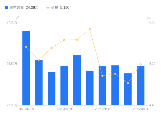 日期A股户数(户)流通A股户均持股数(股)户均持股市值(万元)2025-10-312438956348.073.292025-10-202393126469.643.122025-10-102441596341.203.182025-09-302435886356.073.162025-09-192408516428.303.772025-09-102502896185.903.512025-08-292437866350.913.592025-08-202400936448.593.552025-07-312473736258.823.302025-07-182648715845.343.23