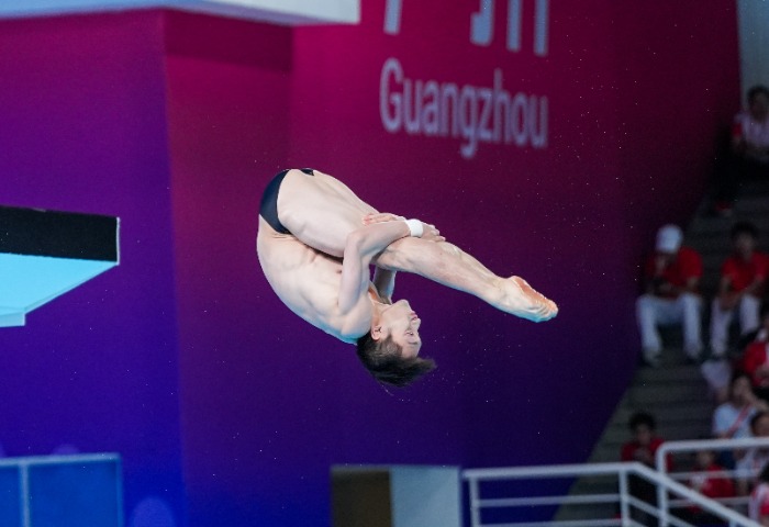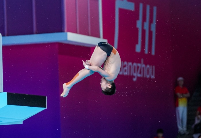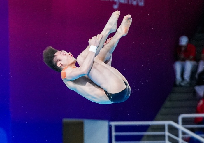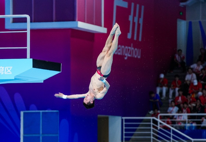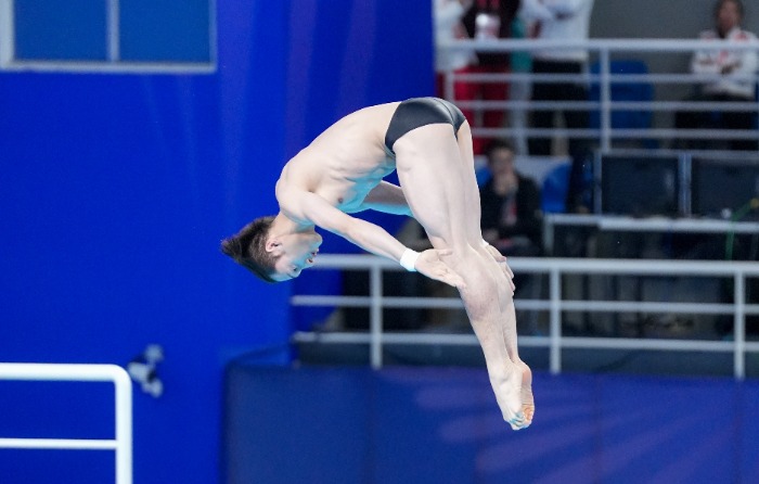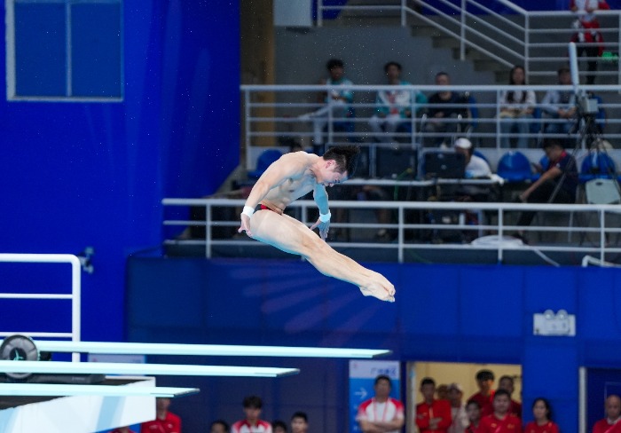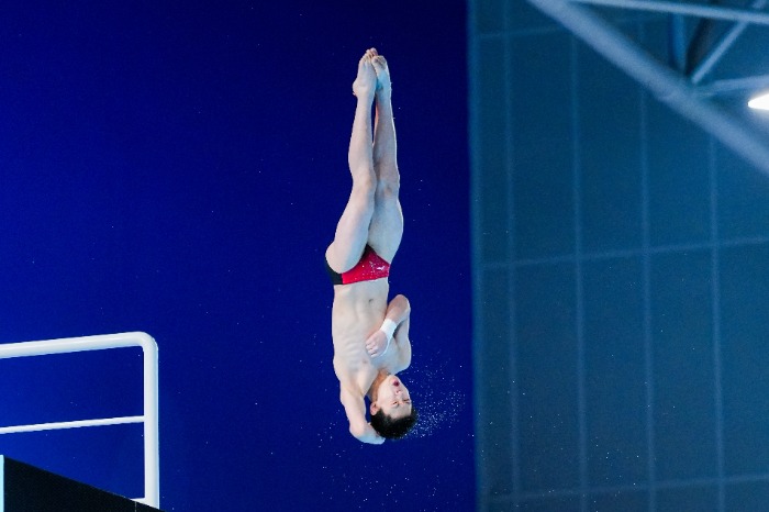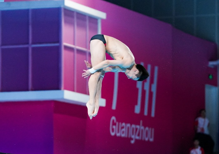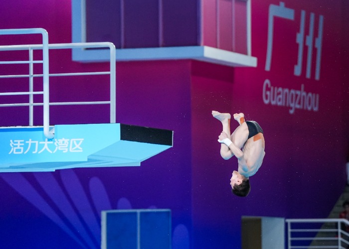 大皖新闻讯第十五届全国运动会跳水项目男子10米跳台决赛11日晚在广东奥林匹克体育中心举行,这是本届全运会跳水项目的收官之战。四块奥运金牌获得者、北京队10米台王者曹缘坐镇,另一位奥运冠军练俊杰关键时刻跳出全场最高分,以3.5分优势惊险夺冠。赵俊杰获得第三名。