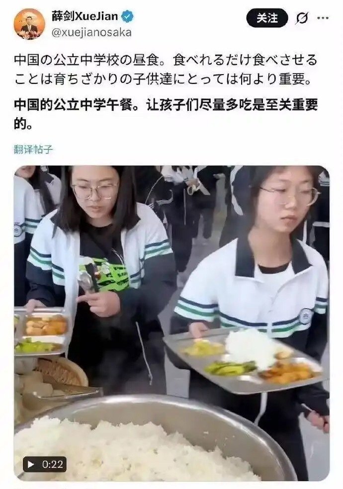 中国驻日本大阪总领事薛剑发了一张中国初中生打饭的照片,结果日本网民纷纷破防了,认