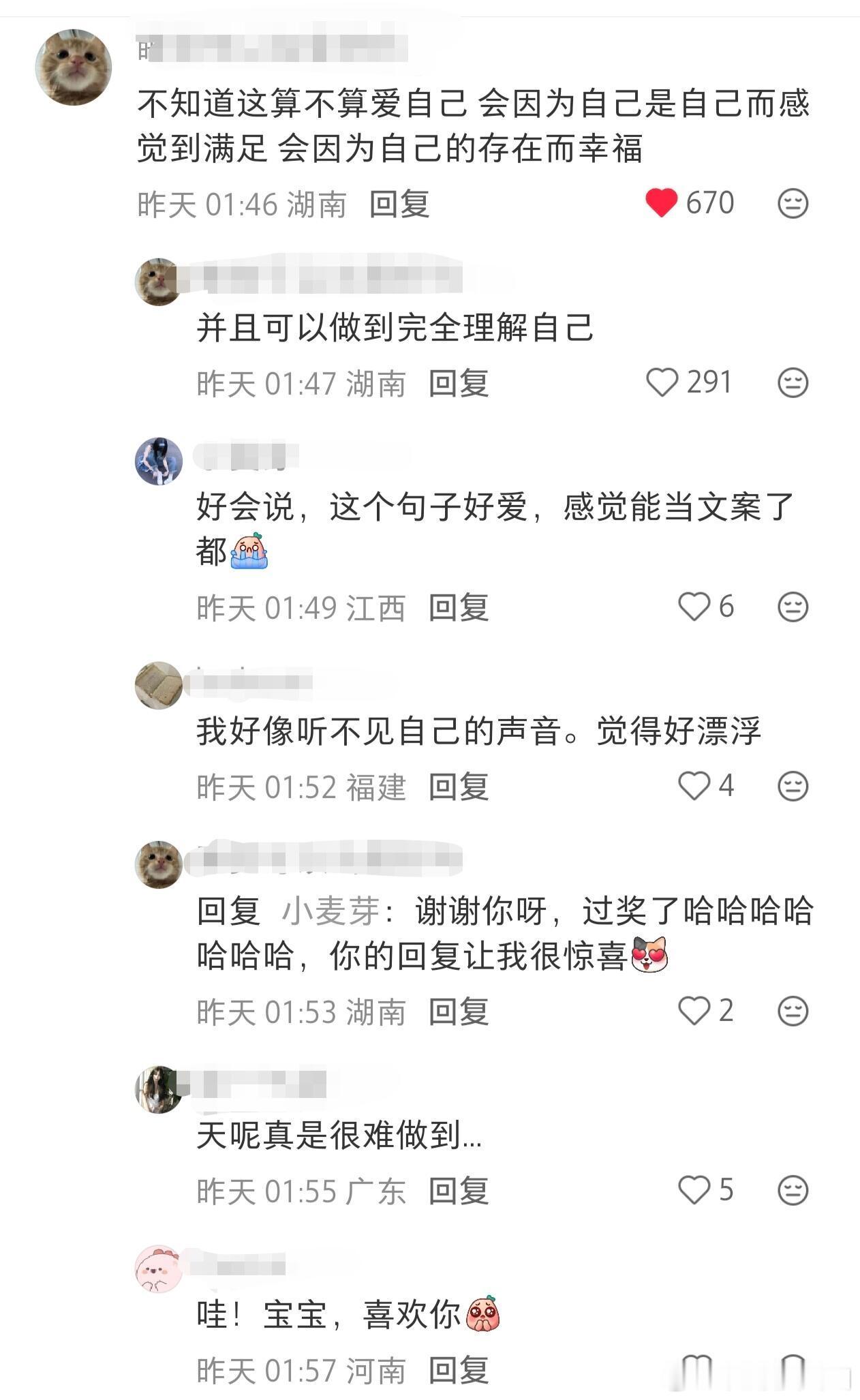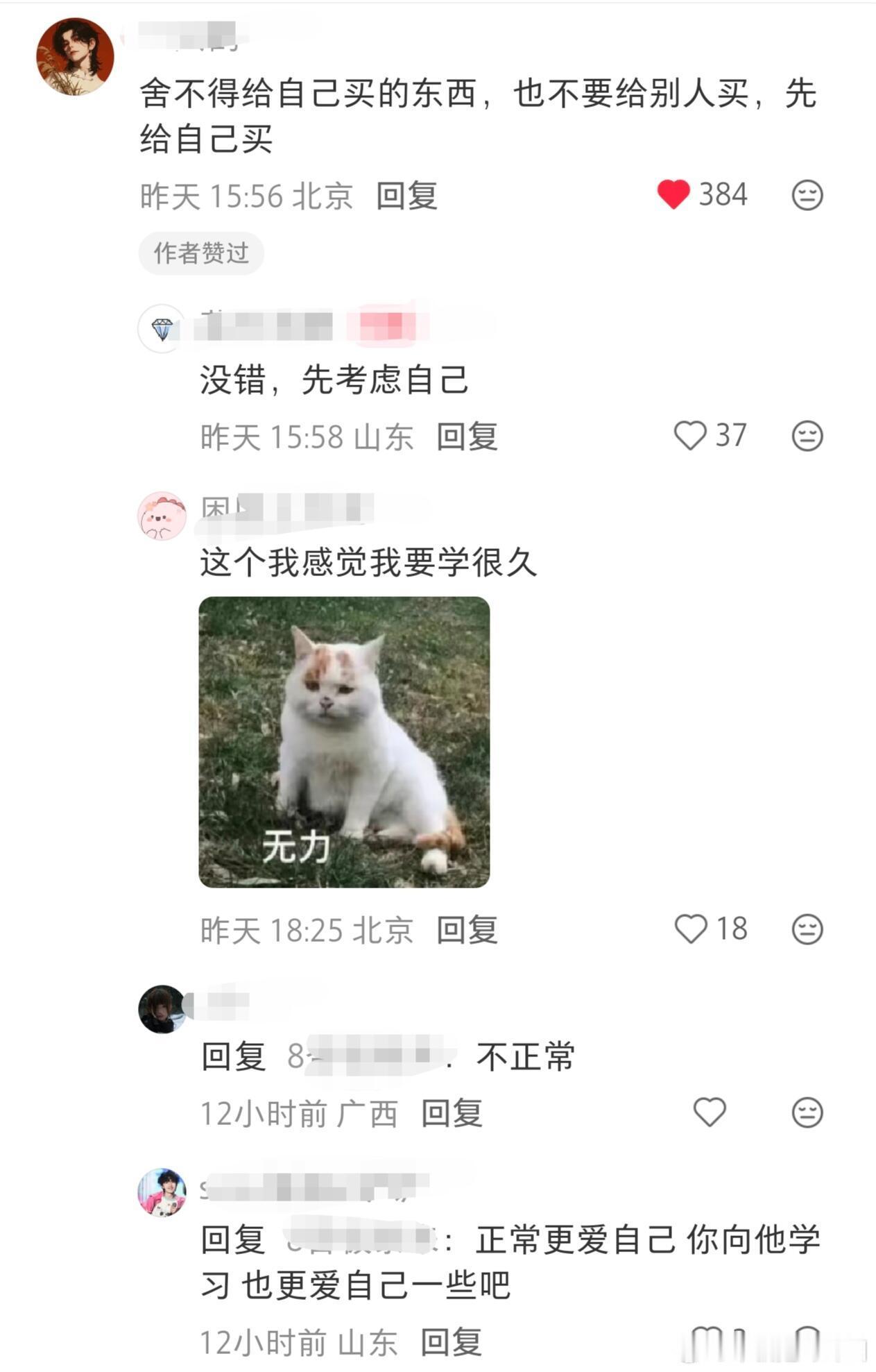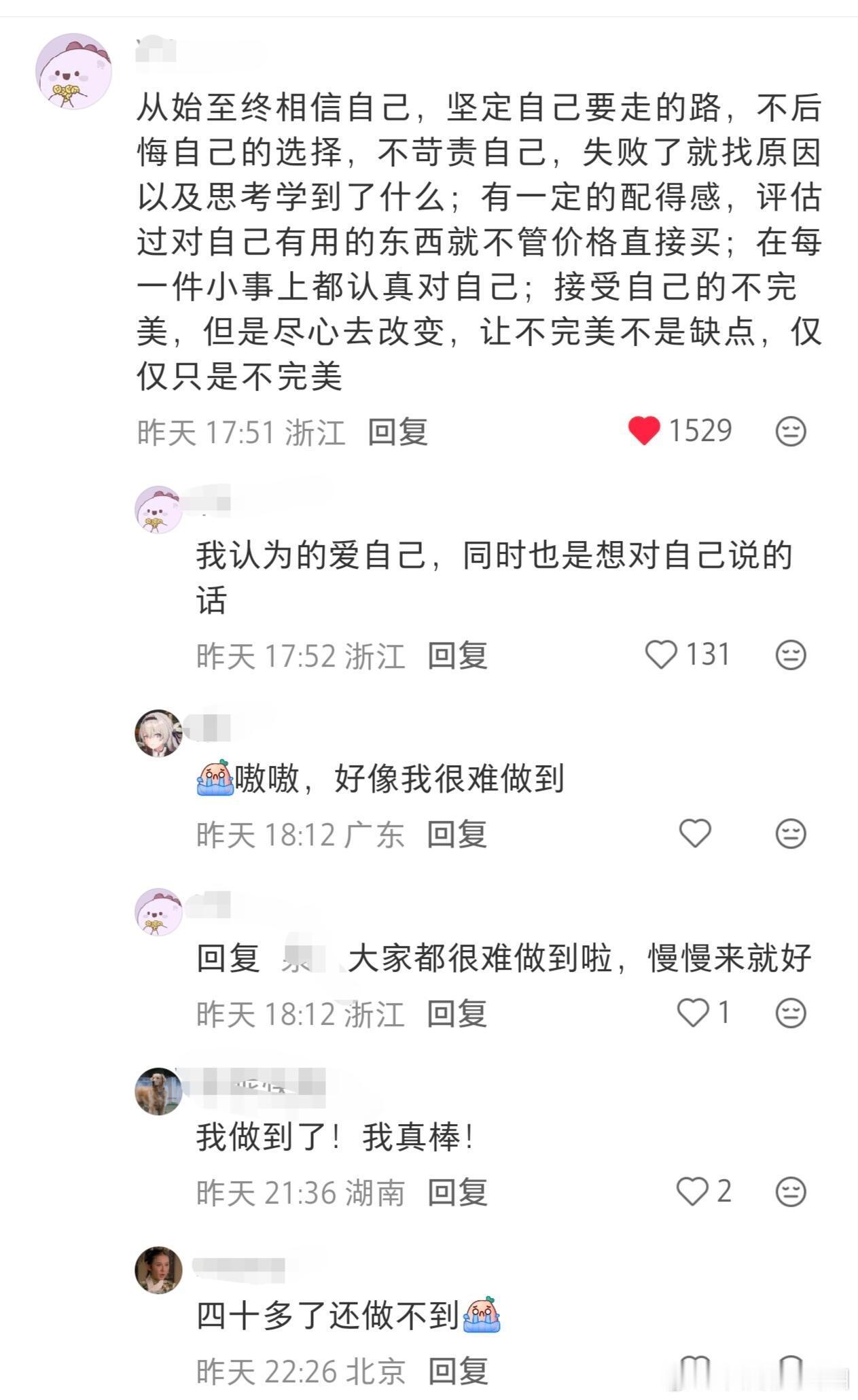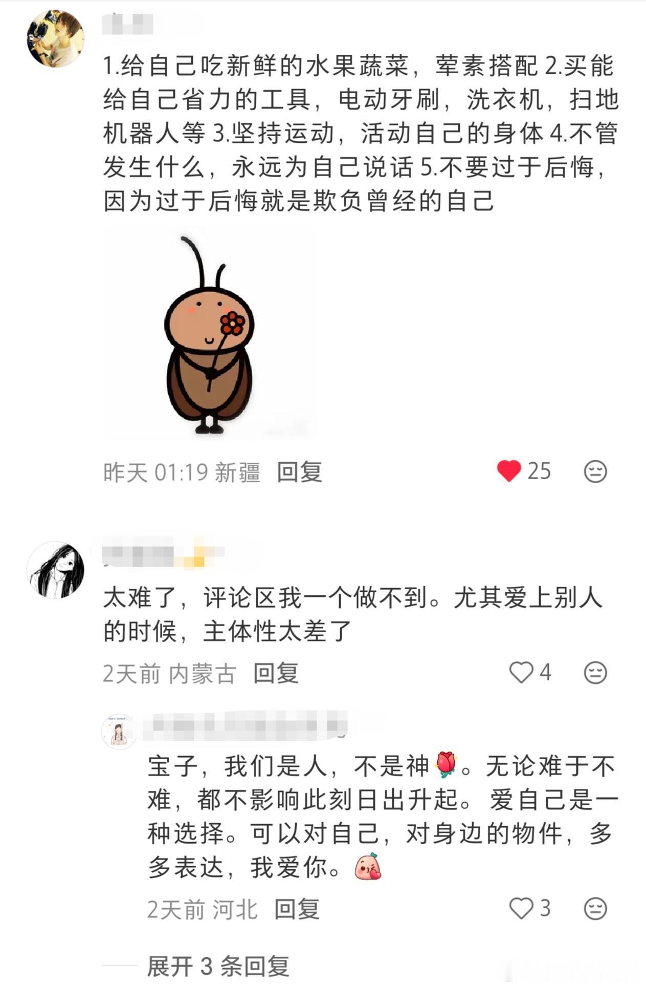我看到的怎么爱自己的帖子最赞同的一点:日常里随身体需求行动、认真对待饮食、理性消费。情绪上坦然接纳并合理释放选择中只留喜欢的事物、拒绝不开心的场合,不因他人评价自我怀疑。