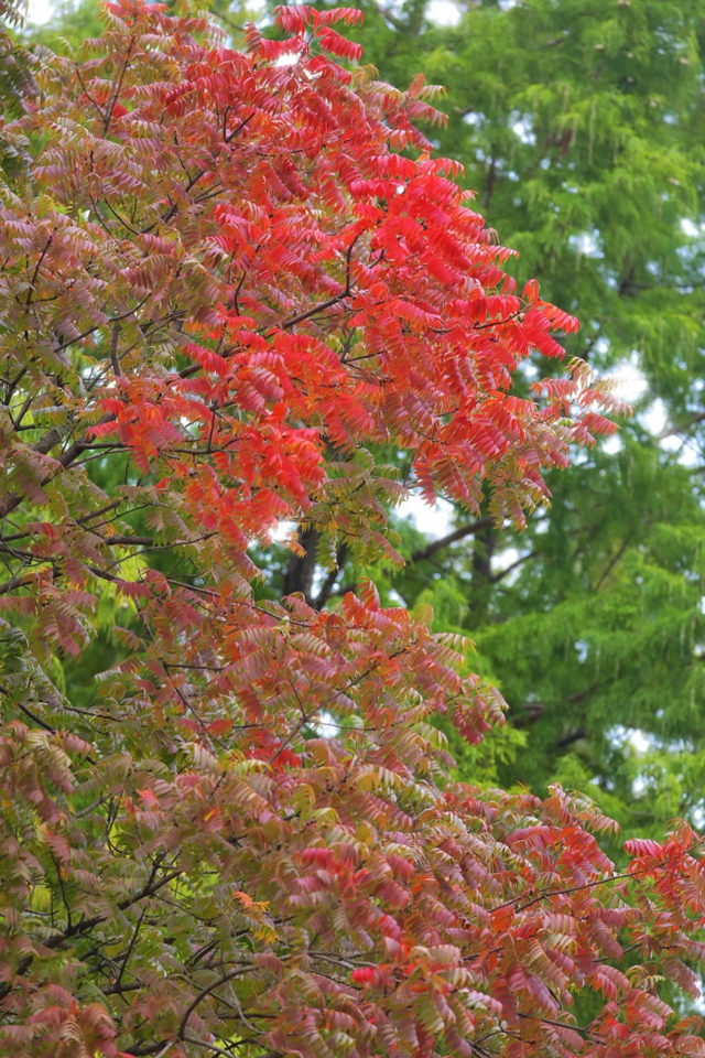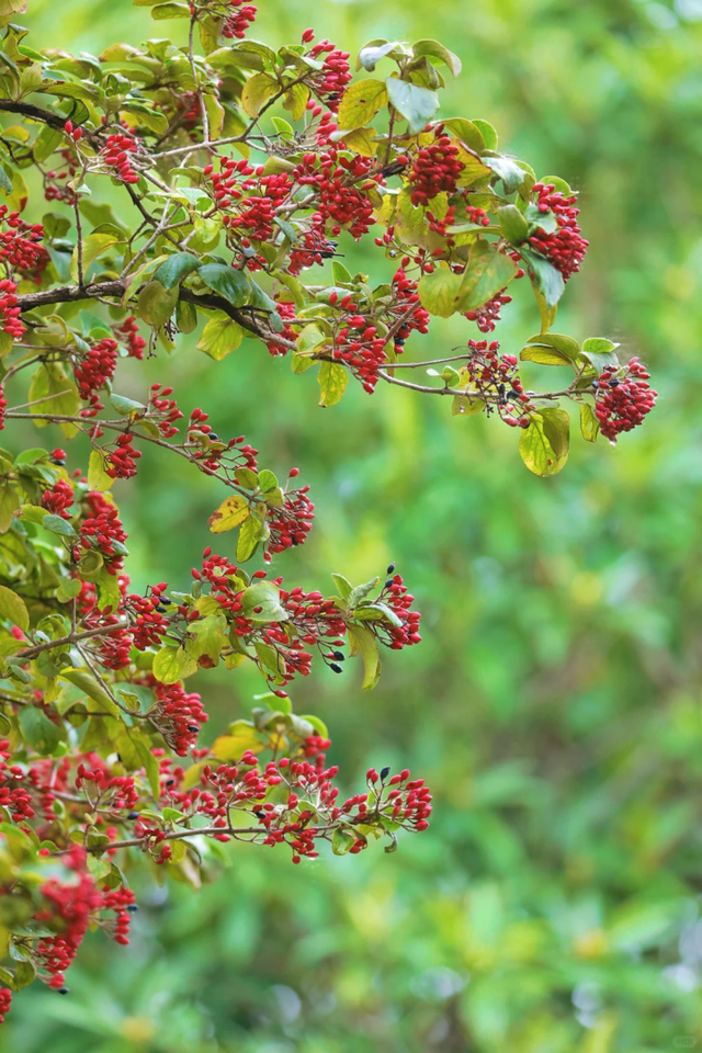 枝头挂着艳红的小果,叶片染着深浅不一的绯红,再衬着未褪尽的翠绿,红、黄、绿三色交织出层次感,按下快门的瞬间,每一帧都成了自带滤镜的美景。