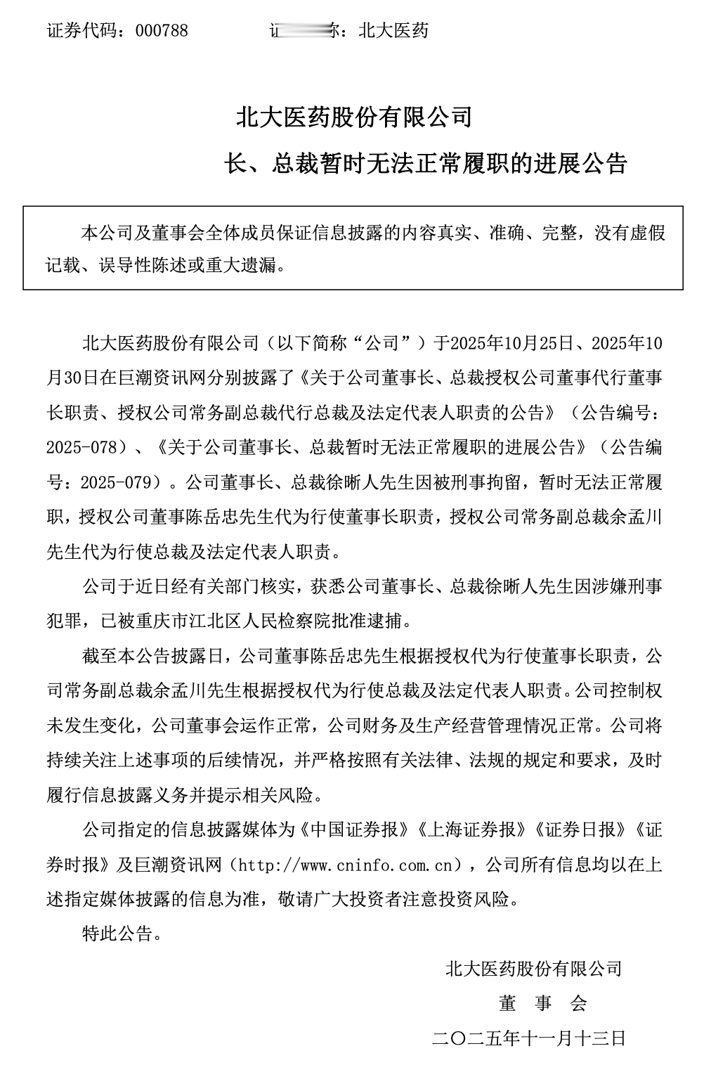 11月12日晚间,北大医药公告,公司董事长、总裁徐晰人因涉嫌刑事犯罪已被重庆市江北区人民检察院批准逮捕。此前公司于2025年10月25日、10月30日披露了徐晰人因被刑事拘留暂时无法正常履职的情况。