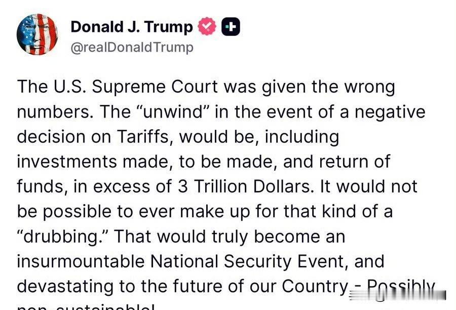 🚨震惊消息!川普总统已确认:如果最高法院推翻其关税政策,美国政府可能需要返还超过3万亿美元。 他在声明中表示: “最高法院被提供了错误的数据。如果最终判决不利于关税政策,涉及到的资金回退、已完成与待完成的投资,总额将超过3万亿美元。 这样的冲击将无法弥补,会成为一次无法承受的国家安全事件,并对美国的未来造成毁灭性影响——甚至可能使国家无法维持正常运作。”