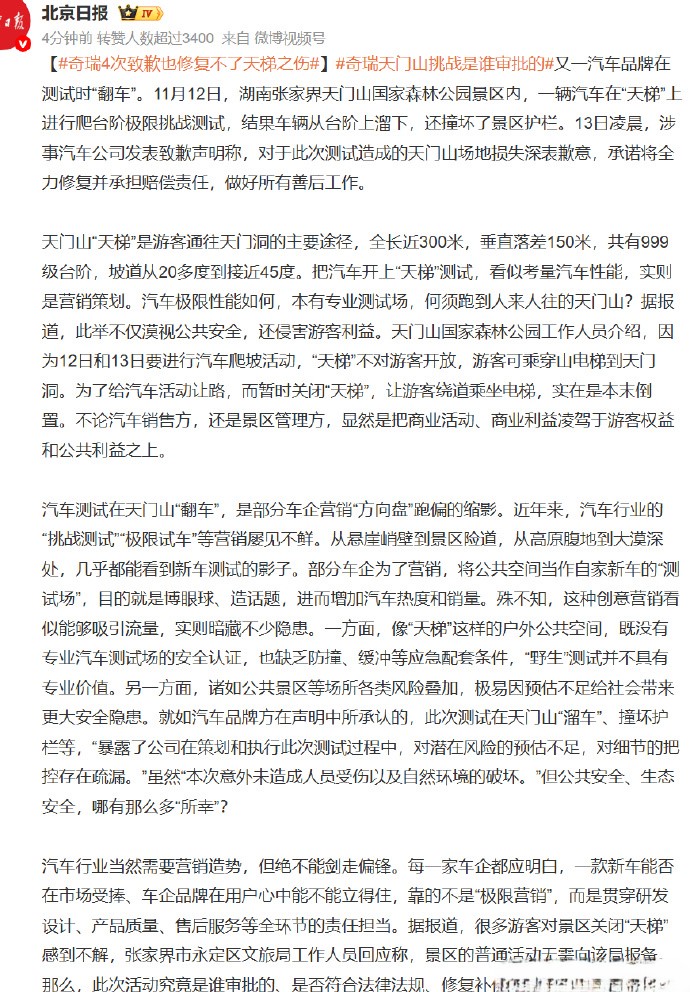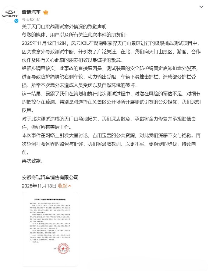 奇瑞汽车挑战张家界天门山失败原因 奇瑞汽车挑战张家界天门山失败原因:防护绳卸扣脱落,是什么意思? 官方说明此事故的直接原因:测试装置的安全防护绳固定点卸扣意外脱落,进而导致防护绳缠绕右侧车轮,动力输出受阻,车辆下滑…… 把汽车开上“天梯”测试,挑战天门山999级陡梯,既是考量汽车性能,也是营销策划。天门山天梯是经营性景区、是现代人工建筑物、非历史文物古迹。 做了必要防护,搞一搞商业活动没问题!有些损坏,修复即可。我觉得,舆论应该允许奇瑞汽车再次挑战天门山天梯,这不仅关乎奇瑞汽车公司的脸面和业绩,更是国产汽车一次“翻车”后的“自我救赎”,本来是营销噱头,现在变成了需要证明自己! 尽管有场景错配的问题:家用SUV核心卖点应为续航、安全等日常性能,非极限场景作秀,但外国品牌路虎成功了、国产品牌奇瑞失误了,需要建立信任,需要再次挑战! 并不是这车性能太菜开不上去,而是防护绳缠绕了车轮,使得动力输出受阻。奇瑞不承认是车不行,奇瑞有信心,我们应该鼓励再次挑战!