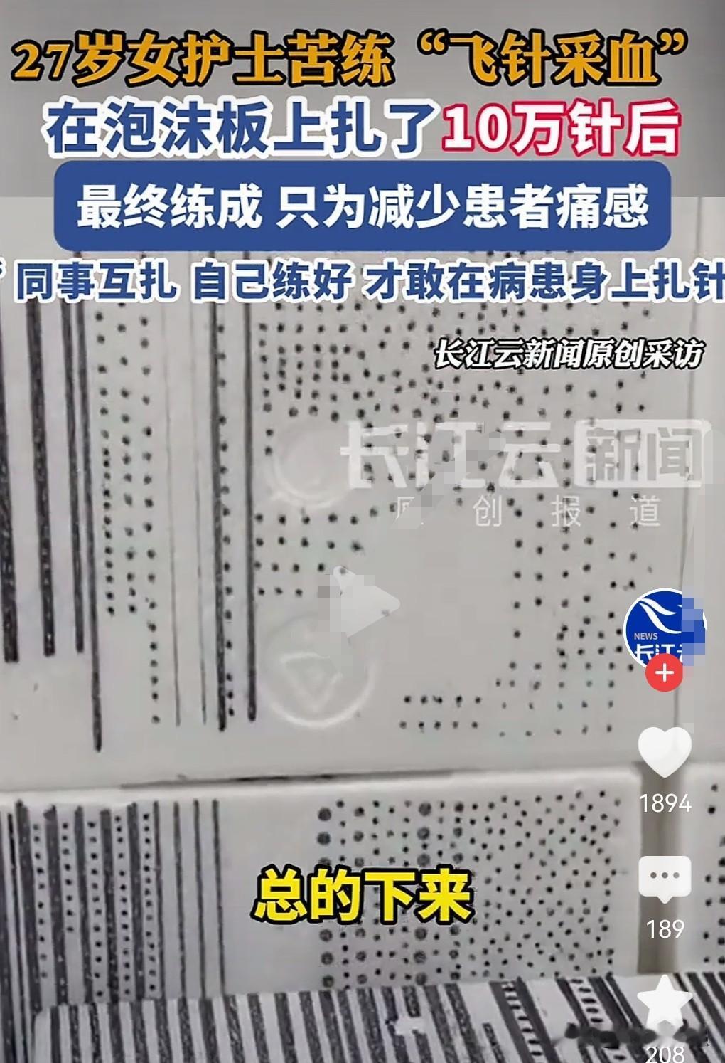 没有人能随随便便成功。 护士这一行也是非常考验技术的,特别是扎针。 11月13日在网上看到这么个事情。 护士在泡沫板上扎10万针练成飞针采血,这真是台上一分钟台下10年功啊。 飞针采血可以减少患者的疼痛感。 那一般的护士没这个水平的。 要通过不断的练习。 让人敬佩。