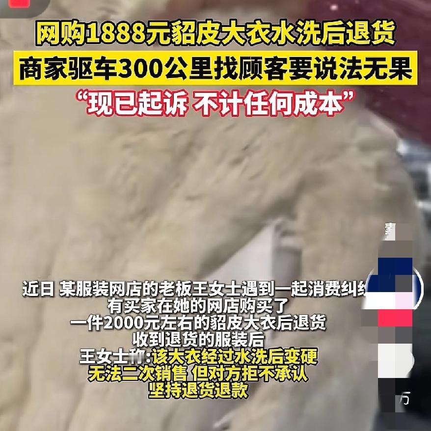 越闹越大 店主已经拿到全部信息 准备起诉买家,坚决硬刚到底,最近闹得沸沸扬扬的,近2000元的貂皮大衣事件,我力挺卖家。 以为7天无理由能钻空子,穿够本洗坏了再退货,这操作简直是让人觉得无耻又自私。 济南店主王女士千小心万小心发货,没成想遇到这种“白嫖党”,衣服返回来又硬又糙,甚至连洗衣粉印记都没清干净。 平台全额退款就算了,买家还装消失,电话不接信息不回,难怪王女士要驱车300公里维权。别觉得商家好欺负,现在人家合法拿到详细信息正式起诉,诉求很明确:退货款+承担全部诉讼费。 有些人真是占便宜占习惯了,穿几天貂最后退货,招网友吐槽。你说你还在你们小区,怎么混得下去。 “无理由退货”是保障权益,不是纵容自私自利,守住底线才是真聪明。 你觉得这事儿店主能胜诉吗?如果遇到这种恶意退货,你会选择忍了还是硬刚到底?干洗维修貂皮 真貂皮大衣 貂皮避坑 网购 消费者权益 维权