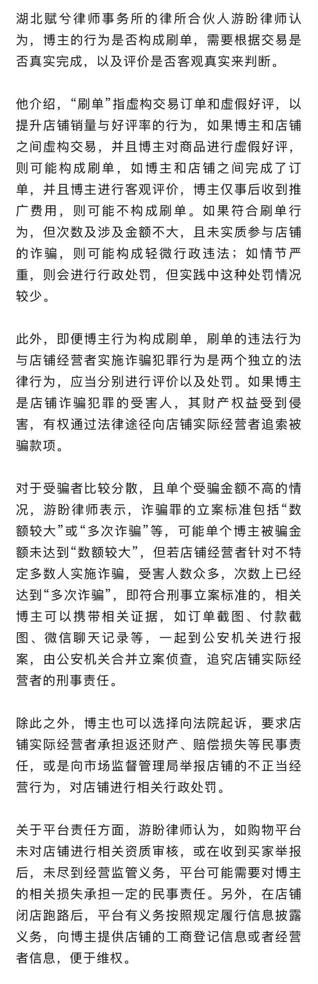 对于网友质疑“博主所做的是刷单行为”,刘女士表示,博主是拿到货品,并付出劳动成果的,衣服的质量之前也是很好的,既不是发空包裹,也不是虚假宣传,谈不上是刷单。“说实话,大家都是有私心的,想接到漂亮衣服,或者赚点零花钱,但我觉得我们真的不至于十恶不赦,被骗了还要被网暴。”刘女士说。