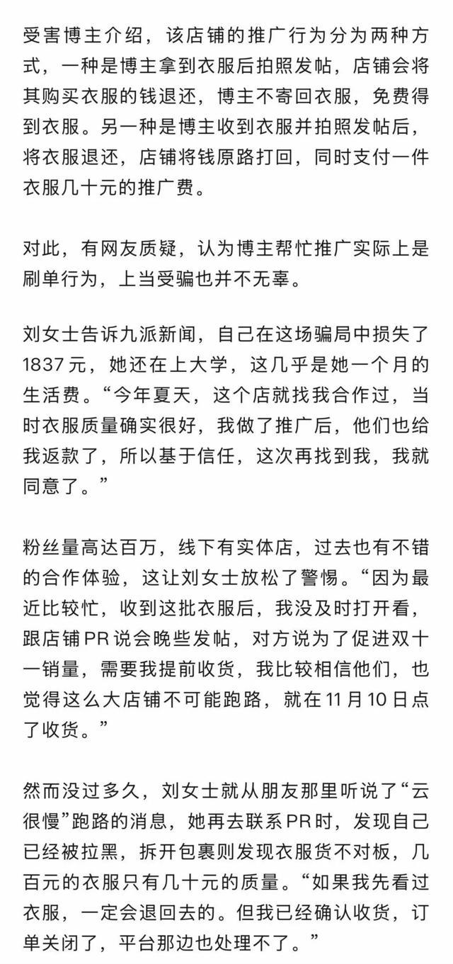 此前,该店铺曾找大量博主进行推广,以“置换”或“送拍”形式与博主合作,博主需先拍下商品支付费用,发布推广帖后店铺再向其返款。该网店闭店前,曾联系大量博主推广秋冬新品,同时诱导博主们提前确认收货,而后卷款跑路。不少博主因此受骗,其中大学生居多,受骗金额从几百元到几千元不等,总额或达百万元,目前已有博主在合肥报警,并以诈骗案成功立案。