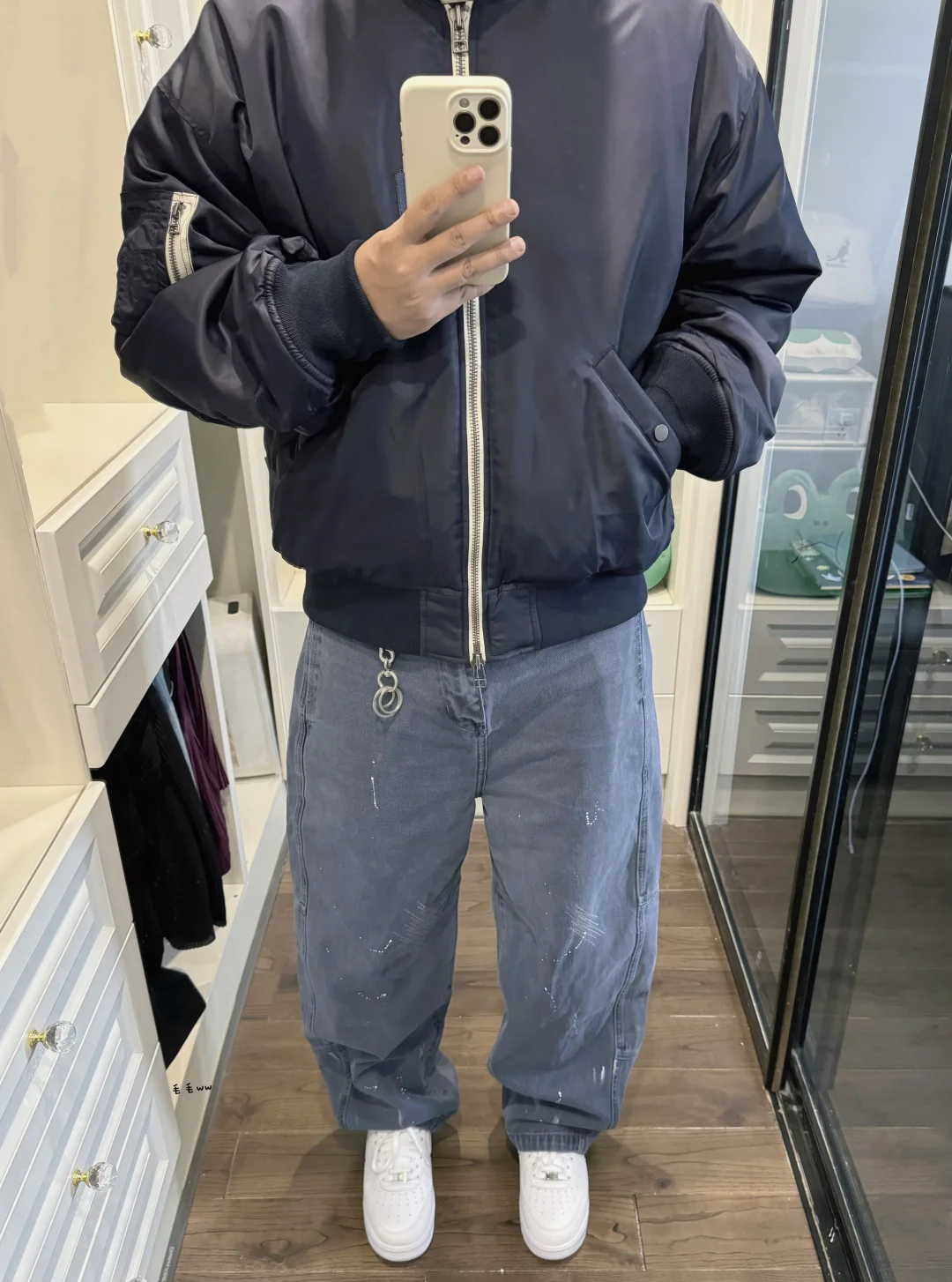 -又到了bomber的季节,MA-1外套之所以经典,就在于百搭的属性;本期蓝色系穿搭,搭配法工裤就很合适,短宽的外套把整体比例拉长,显高显瘦显腿长 . —————— . 👔Massulti // L . 👖Expensive Taste // M . 👟Air Force 1 / NOCTA // 42 . —————— . ✏️本人178cm75kg 球鞋尺码265mm(正常EU42) . 💭以上均为我个人观点,不喜勿喷,欢迎讨论