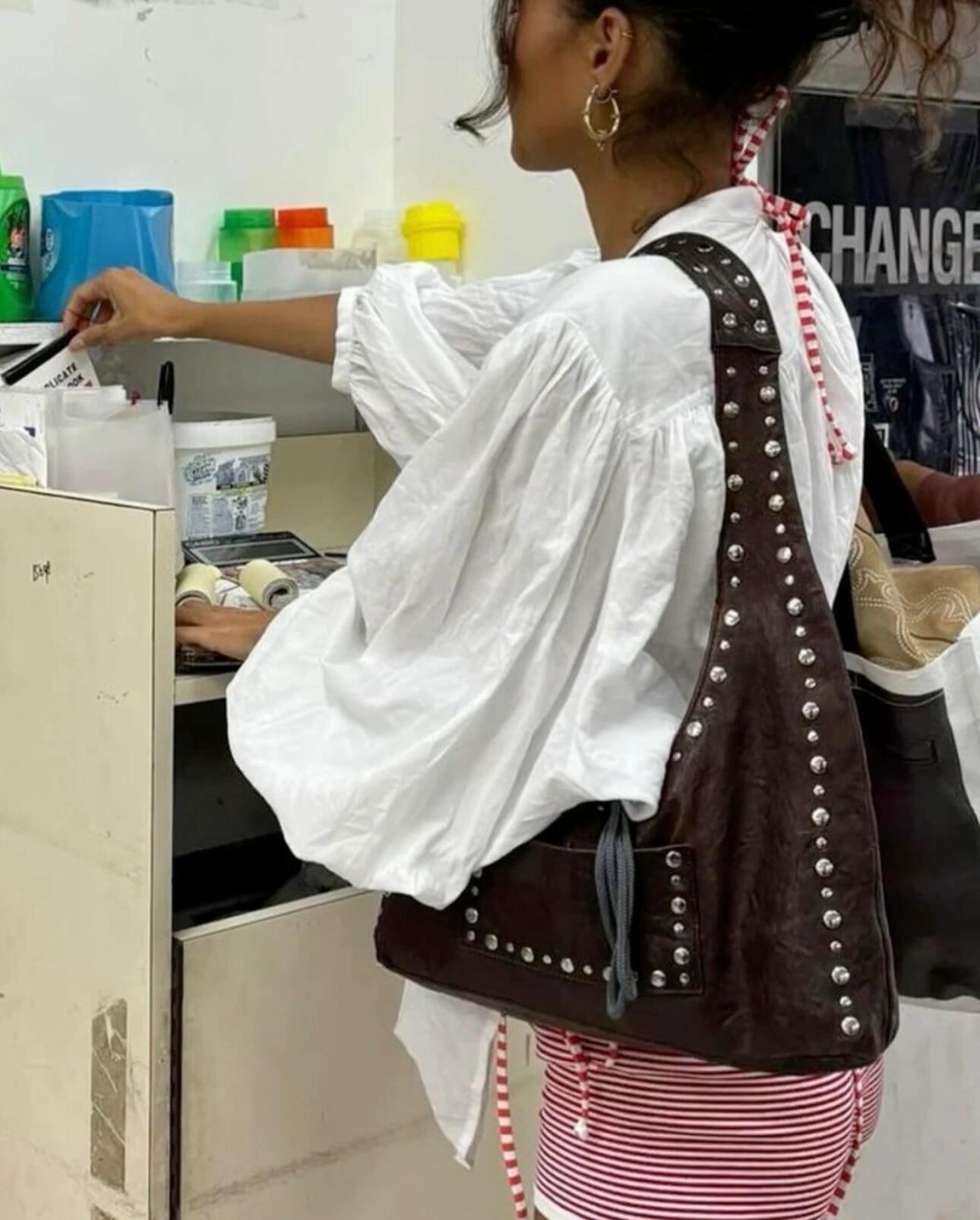 【Gimaguas Franca Bag | 时髦精的日常仪式感】纵使奔赴菜场,亦需风格随行。Gimaguas棕色Franca手袋,以褶皱肌理诠释复古美学,做旧质感暗藏巧思,慵懒廓形适配多元穿搭,让日常琐碎亦成秀场。