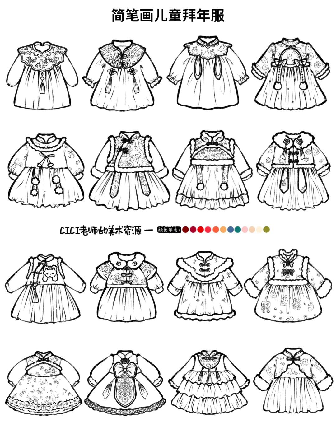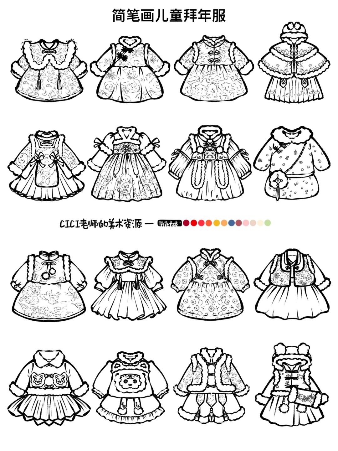 💃儿童画人物新年穿搭,喜气洋洋春节拜年服, 🧧国潮风棉袄连衣裙,新中式冬季衣服套装练习, 👩🎨备注:不是原创,图2临摹,图3-5参考的照片,临摹的作品不上色,参考上色作品去原作者那里找哦。 🈲️商用勿转载,仅供学习参考,🎨临摹请注明出处并